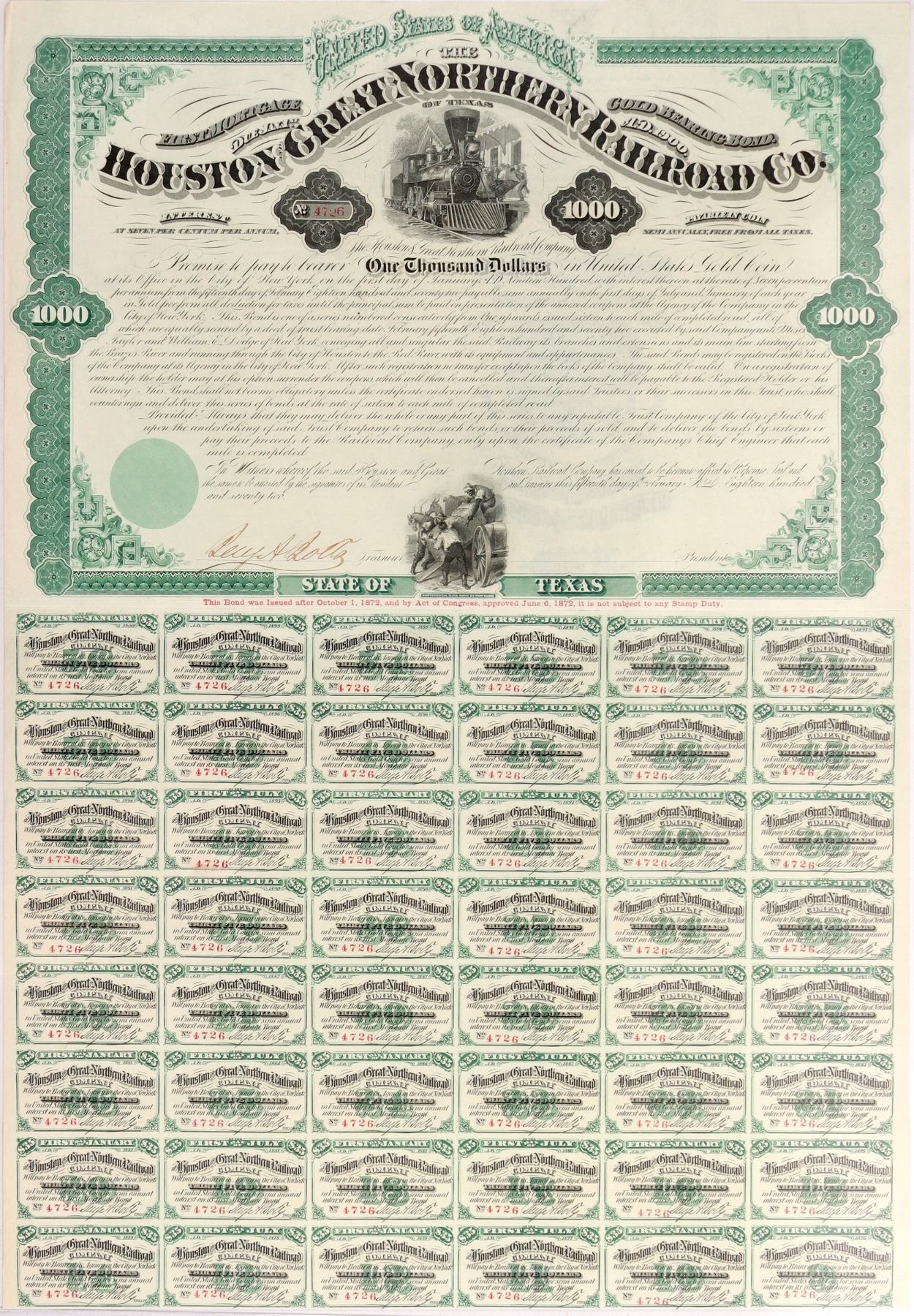 $1,000 1st Mortgage bond for Houston & Great Northern Railroad Co. of Texas, 7 % bond cert. # 4726 with 55 coupons payable Jan 1, 1900. Signed by treasurer. Green border, green blank seal underprint of train in oval. Vignette of train in station at top center, bottom center 3 men loading a box on wagon. Printed: In border by Continental Banknote Co. NY. Houston & Great Northern Railroad Co chartered on Oct 22, 1866 to run from Houston to Red River on Canadian border. Organizers included Edenezar B. Nichols, William Marsh Rice of Texas and Moses Taylor of NY. 1st president was Charles G. Young. 55 miles of track between Houston and New Waverly laid In 1871. Following year 56 more miles laid between New Waverly and Crockett. Acquired the Houston Tap and Barazoria Railway in 1873 and the Huntsville Branch, a total of 58 miles. That year it laid 84 miles of track between Crockett and Palestine and between Troup and Mineola. In 1873 it transferred its 253.1 miles of track to the International-Great Northern and became part of that system.