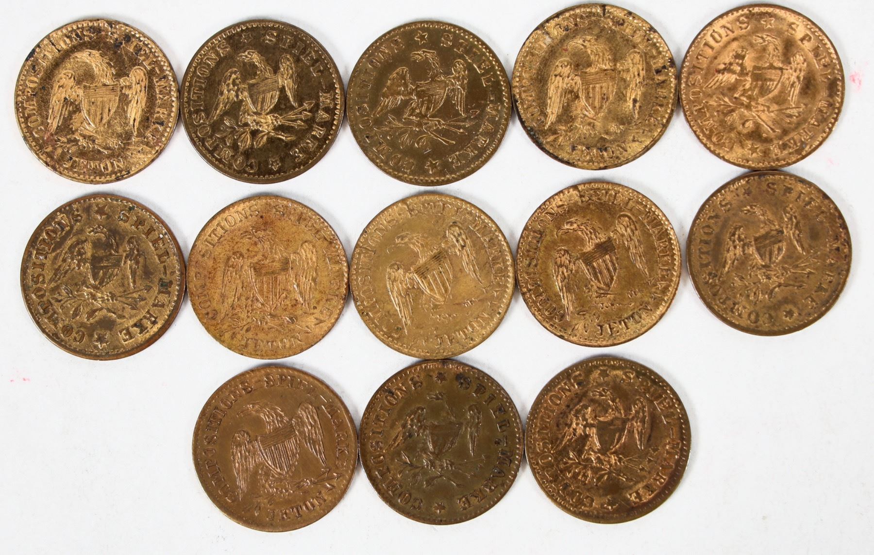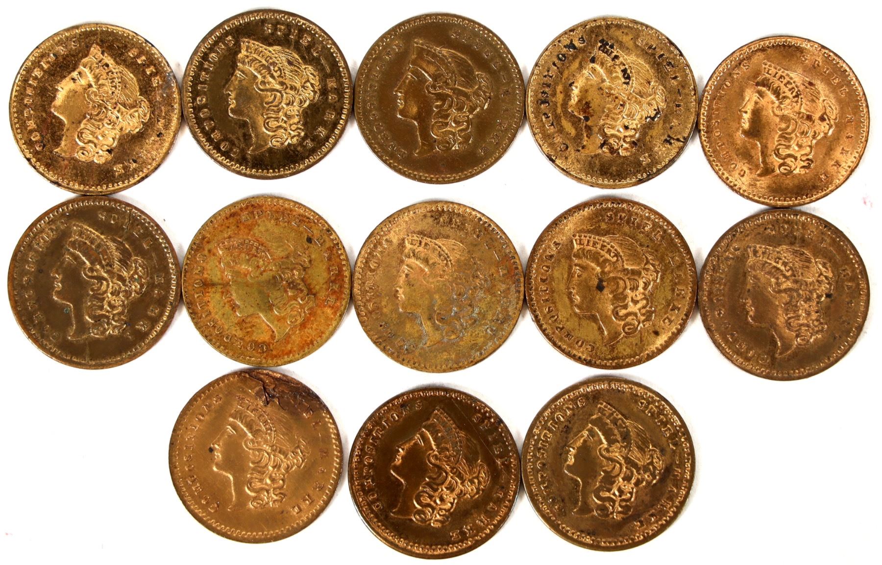 Lot of 13 spiel markes patterned after the $1 U.S. gold piece, all in AU-Unc condition.