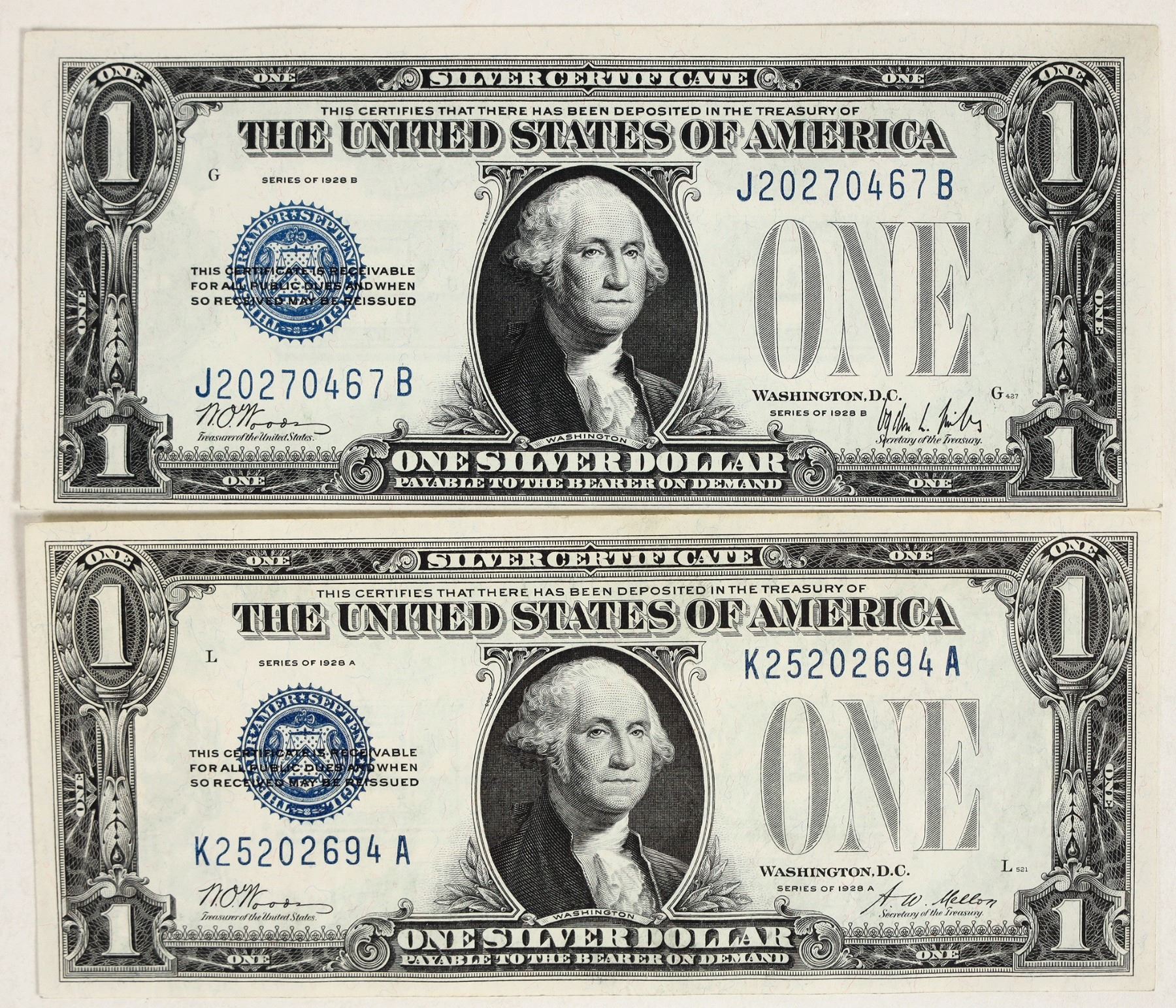Two one dollar silver certificates: Series of 1929 A (AU condition) and Series of 1929 B (Crisp uncirculated).