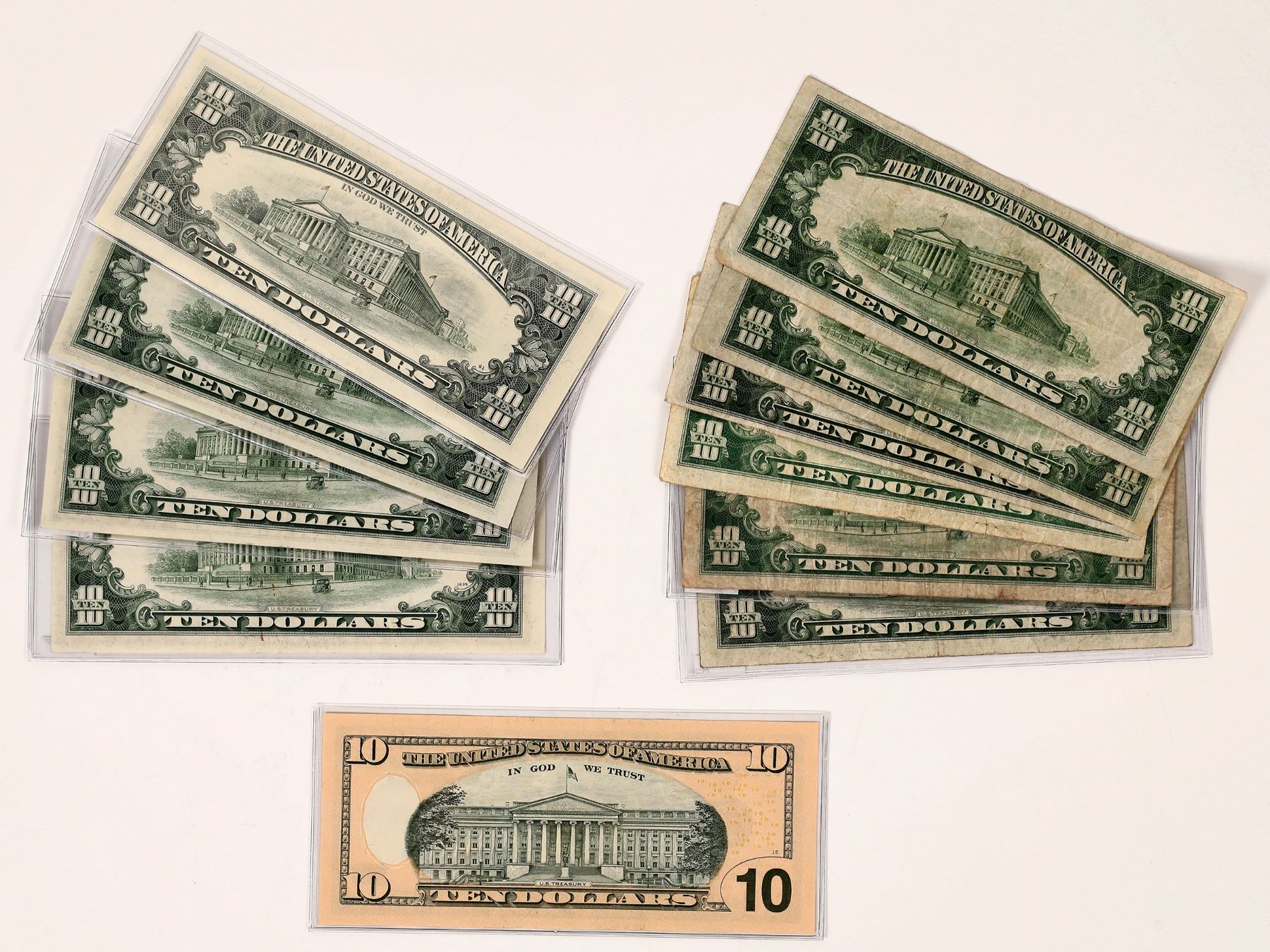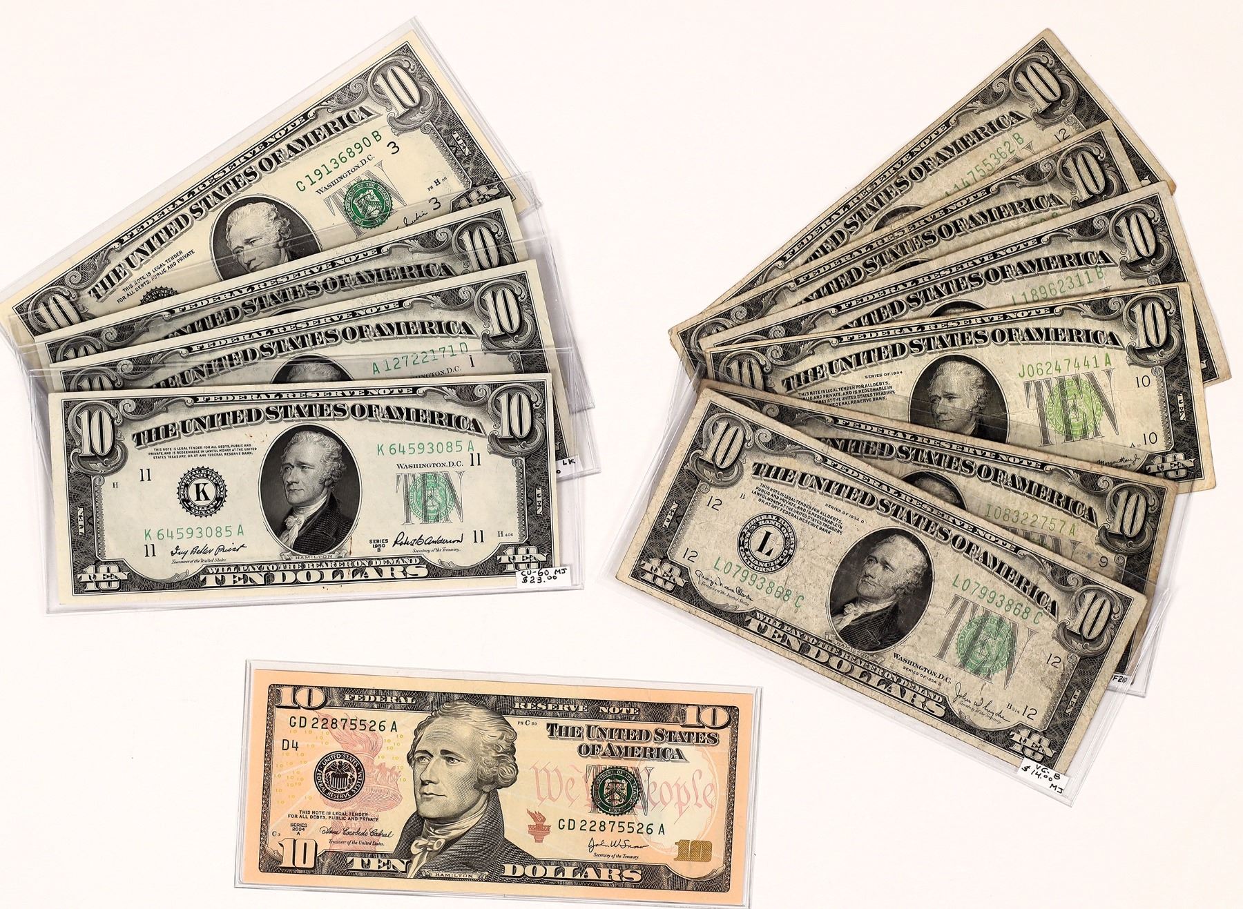 Lot of eleven $10 Federal Reserve Notes: Series 2004A, CU; Series 1928B, VF; Series 1934, F; Series 1934A, F; Series 1934A, G (2); Series 1934D, VG; Series 1950B, CU; Series 1950D, AU (2); Series 1995, CU.