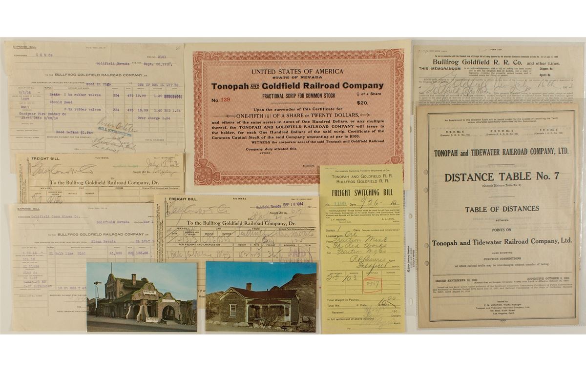 10 Bullfrong area Railroad Ephemera Lot: post card, expense bill, bill of lading, table of distances