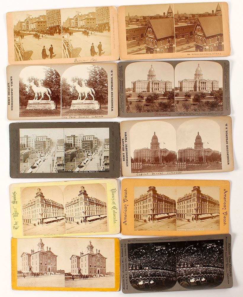 10 Denver stereoviews. Courthouse? by Collier, 2 street scenes by Kilburn Bros, state capitol by Underwood & Underwood, capitol and street scene by Bert Healey, Democratic Convention 1908 by Keystone View Co., 2 Windsor Hotel and street scenes by uncredited. HWAC# 53225 Date: Location: Denver, Colorado