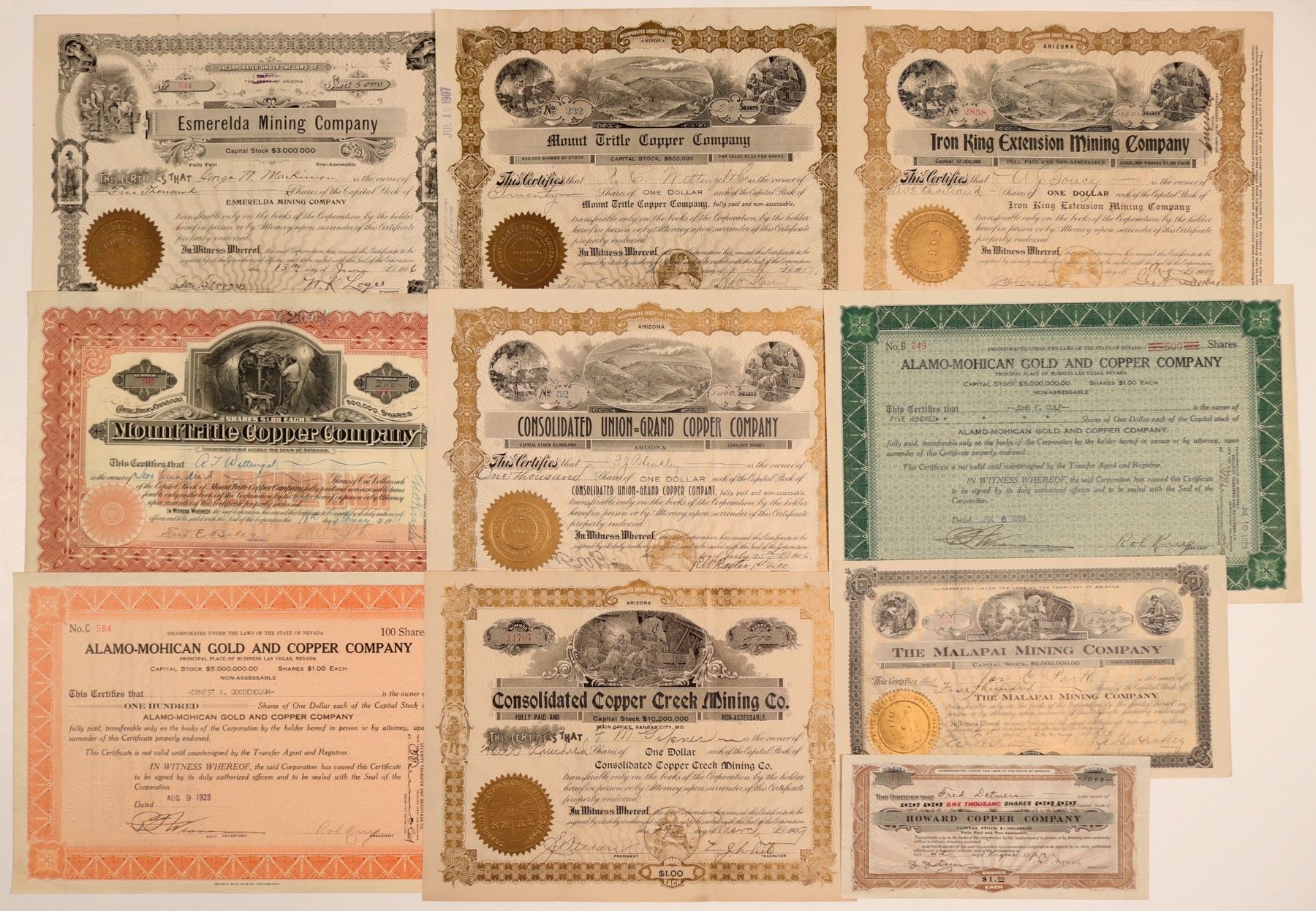 Lot of 10 different. Included: Malapai MC (1910, Kirkland Mining District); Esmerelda MC (1906, Black Hills Mining District); Howard Copper Co. (1919); Mount Tritle Copper Co. (two different, 1907 and 1908); Cons. Union-Grand Copper Co. (1906); Iron King Extension MC (1904); Alamo-Mohican Gold & Copper Co. (two different, 1928); and Cons. Copper Creek MC (1909, Mayertown). Many with vignettes. Please inspect.