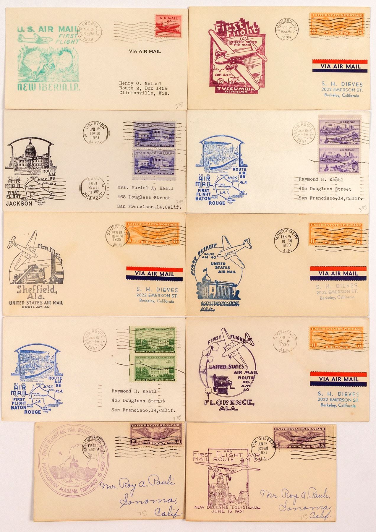 Five Alabama, one Mississippi, and four Louisiana first flight covers, ten total. Plus spectacular postage stamps of the period. State: Southern City: Date: