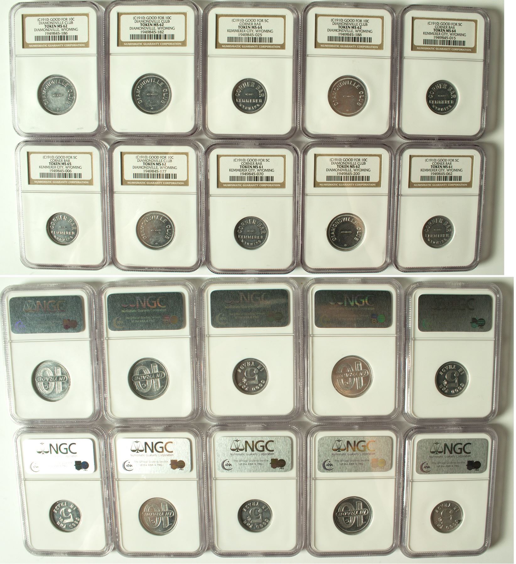 10 tokens, Diamondville Club, Diamondville, Wyoming. Five are 5 cent and five are 10 cent. Approx 1910. State: Wyoming City: HWAC#: 47865 Date: