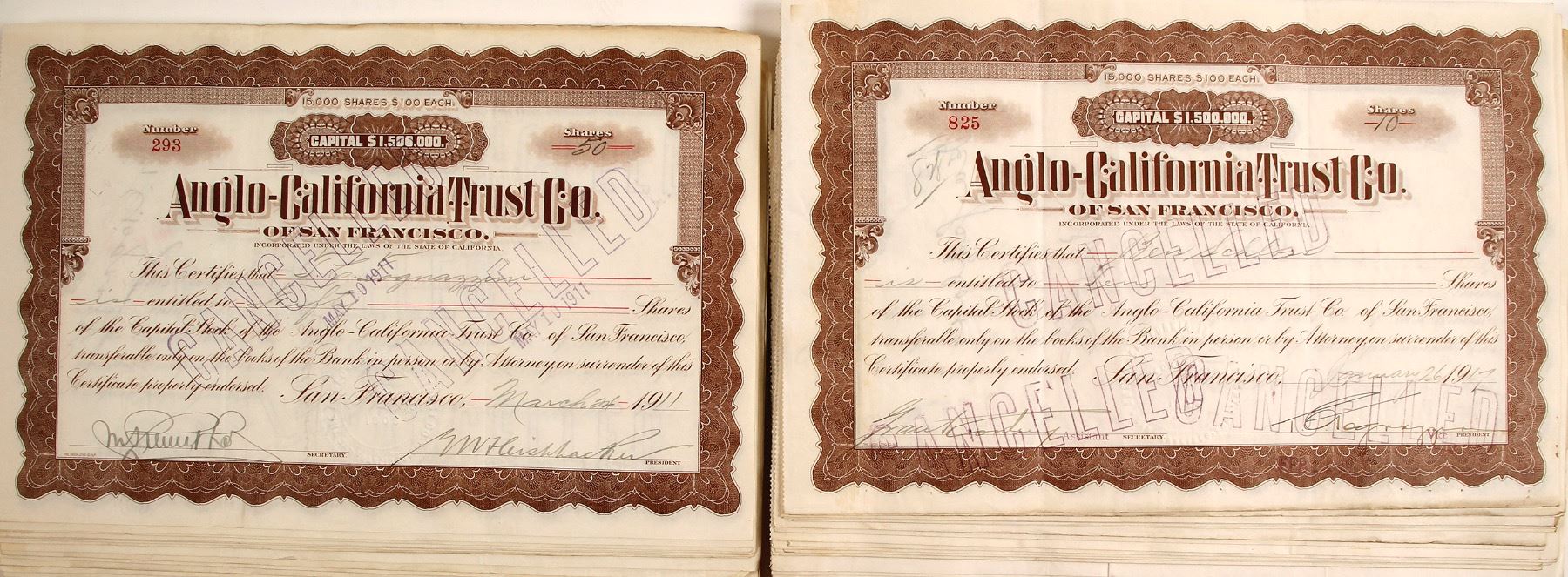 100 Anglo-California Trust Co. of San Francisco Stock Certs. Ranging from no. 293 to 1374. Signed by Presidents of the day & some punch canceled. HWAC# 57547 Date: 1911-1926 Location: California