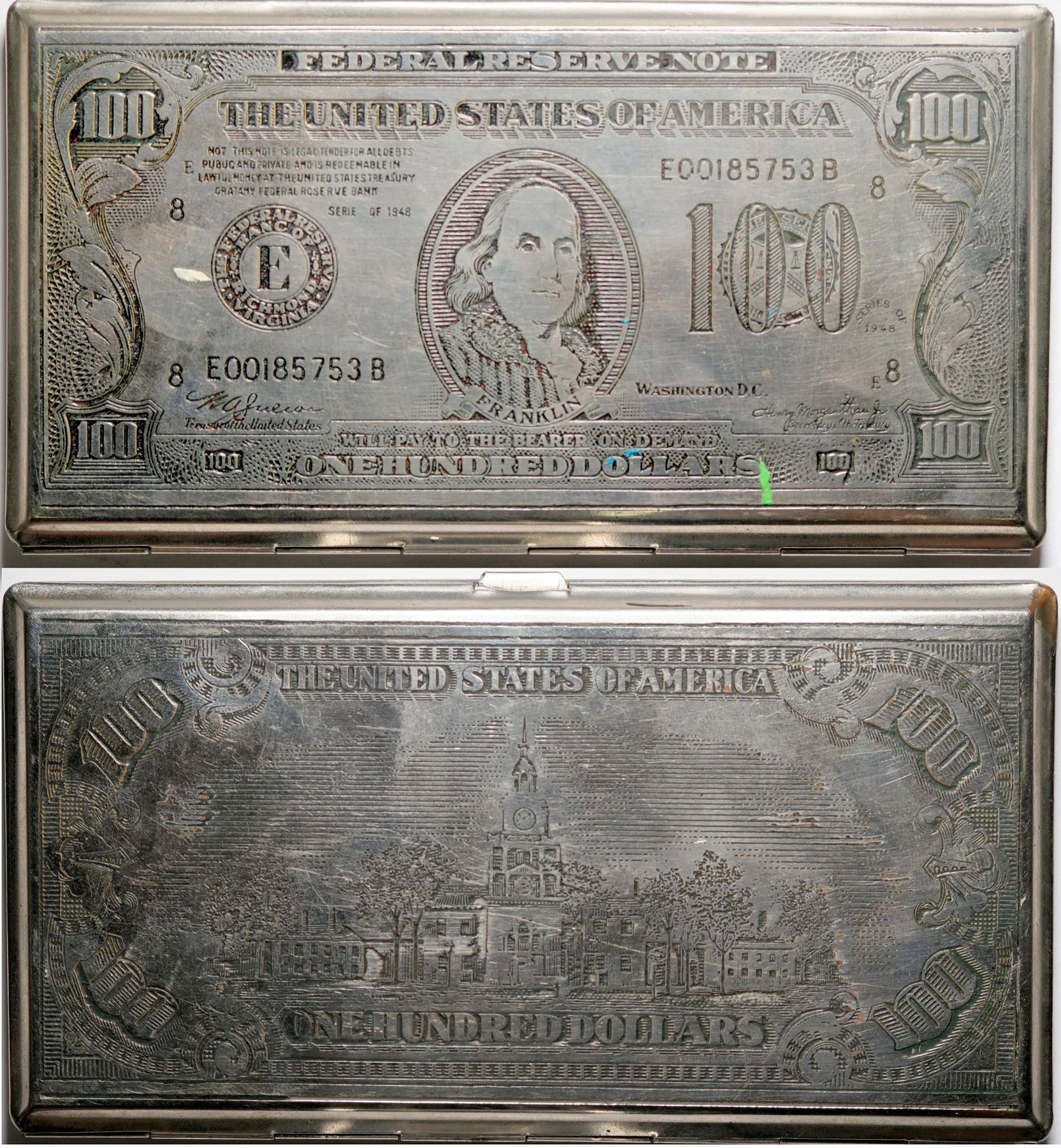 Rare metal case 6 x 3 inches, 1/4 inch thick, with a 100 Federal Reserve Note Series 1948 obverse and reverse. Maybe a cigarette holder? Probably circa 1950.