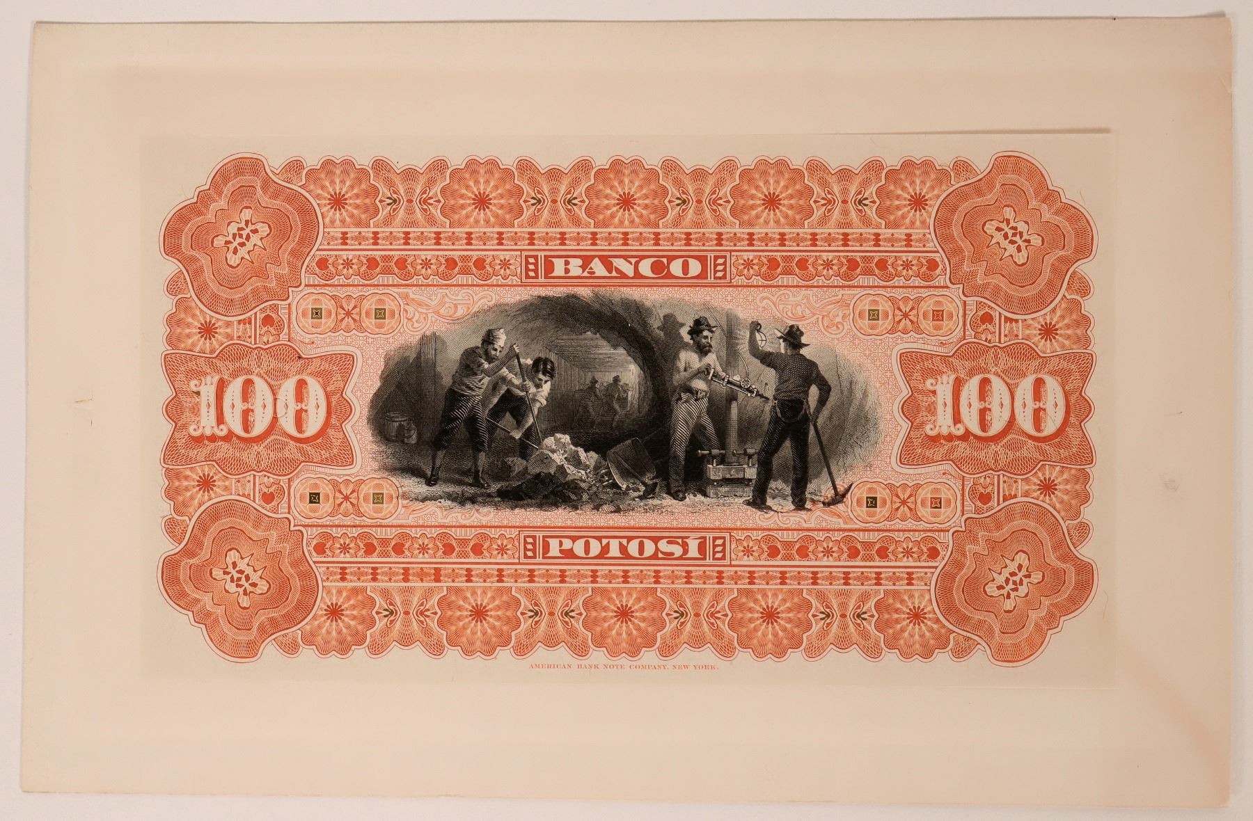 Banco Potosi 100, orange printing w/vignette of miner working underground. American Bank Note Printer. Mounted and in plastic sleeve. PROOF.