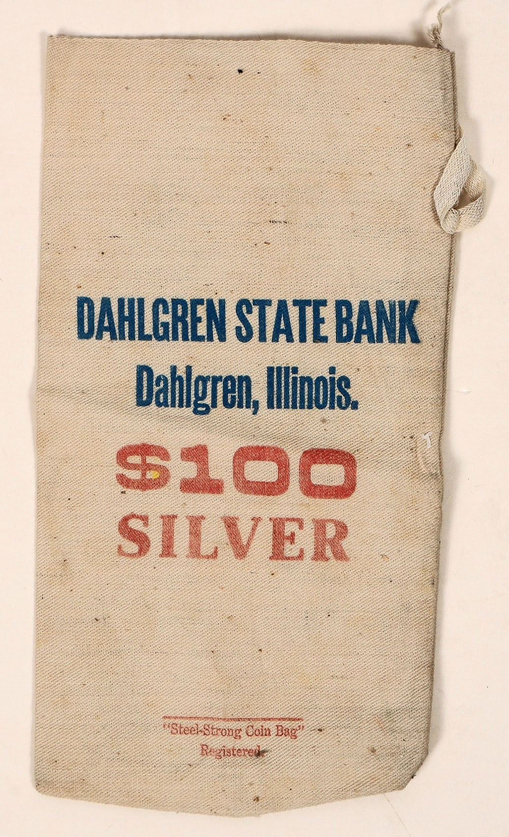 Canvas $100 silver dollar coin bag. Dahlgren State Bank, Dahlgren, Illinois. 9x5". Il