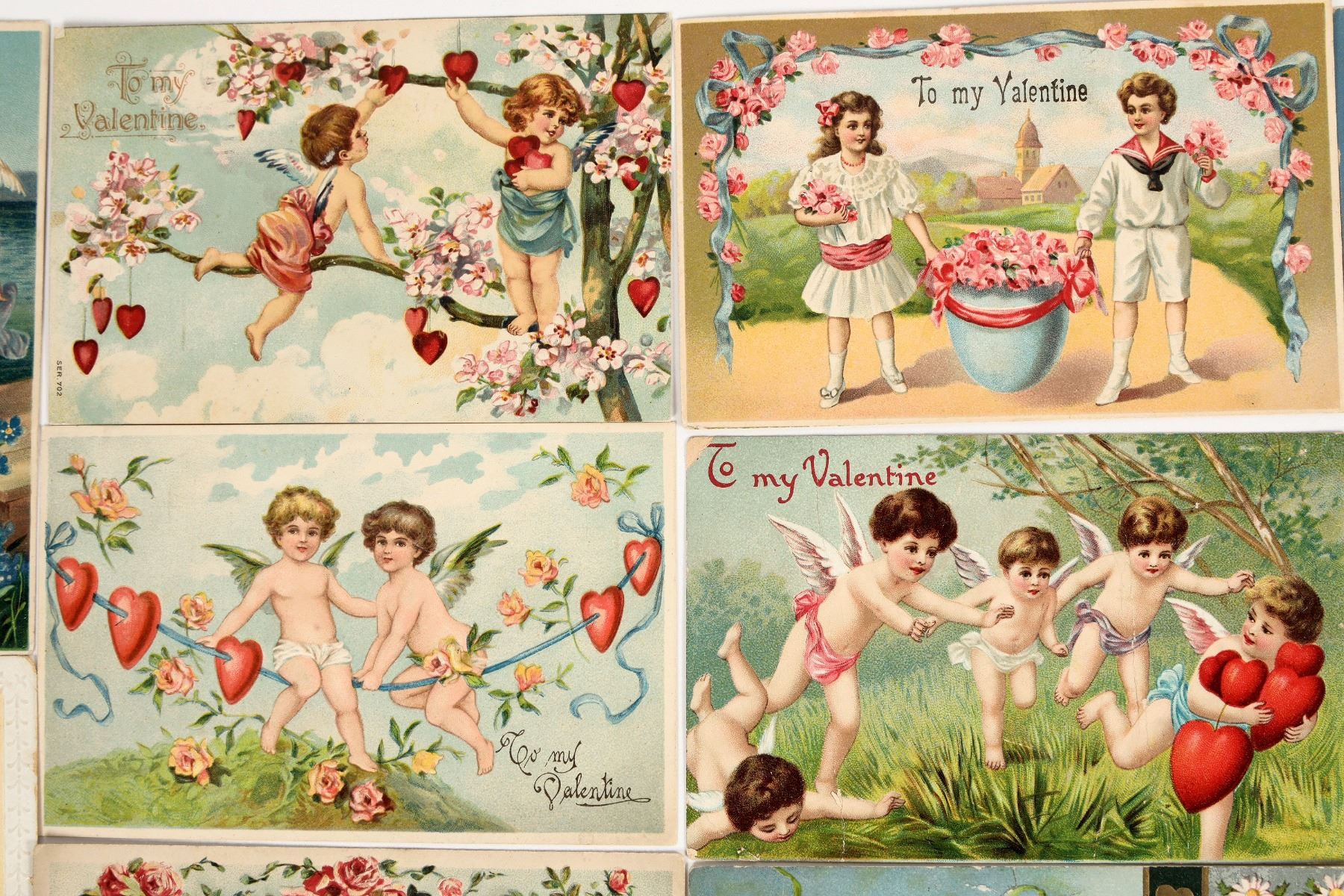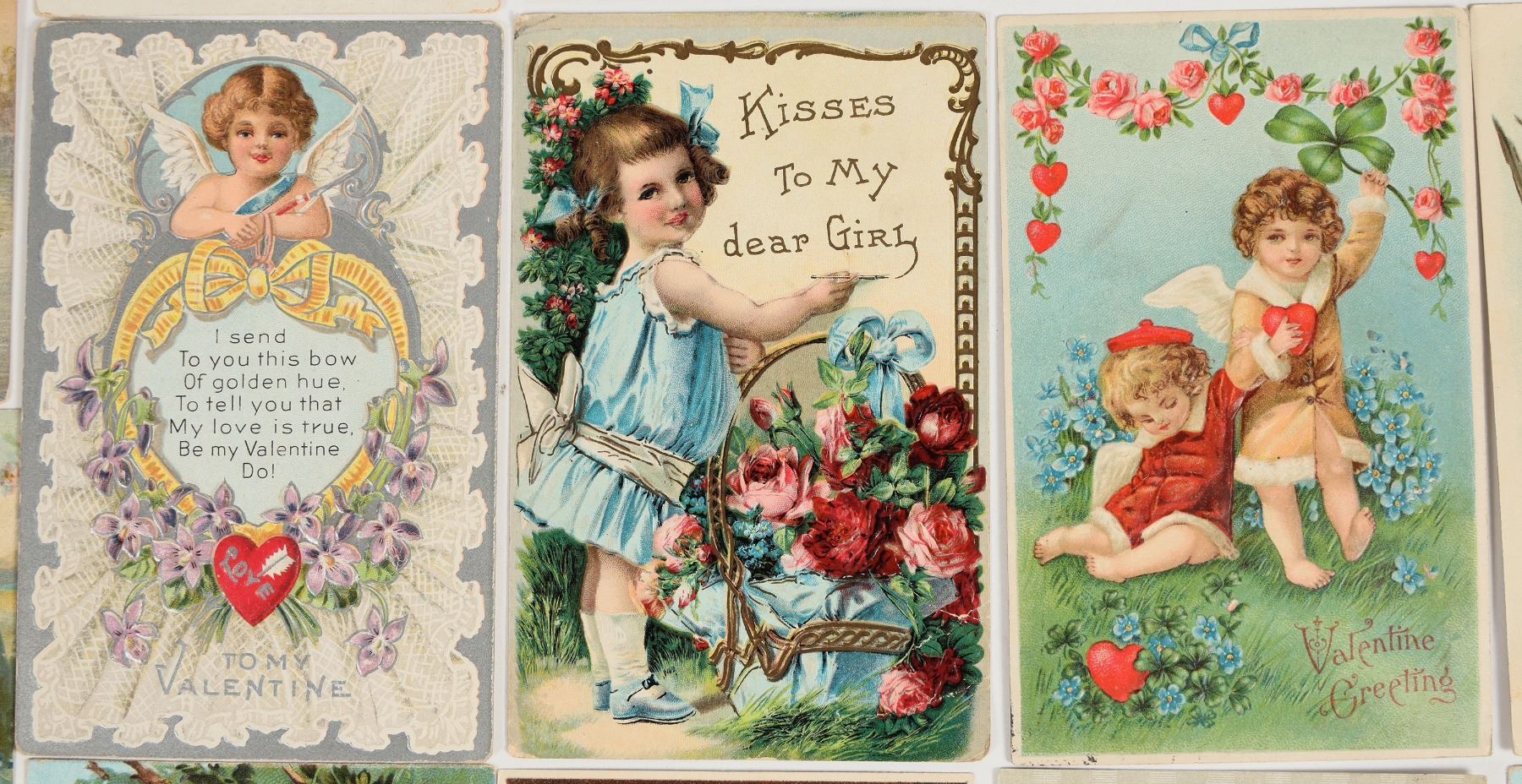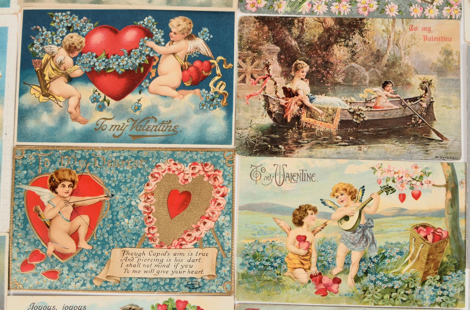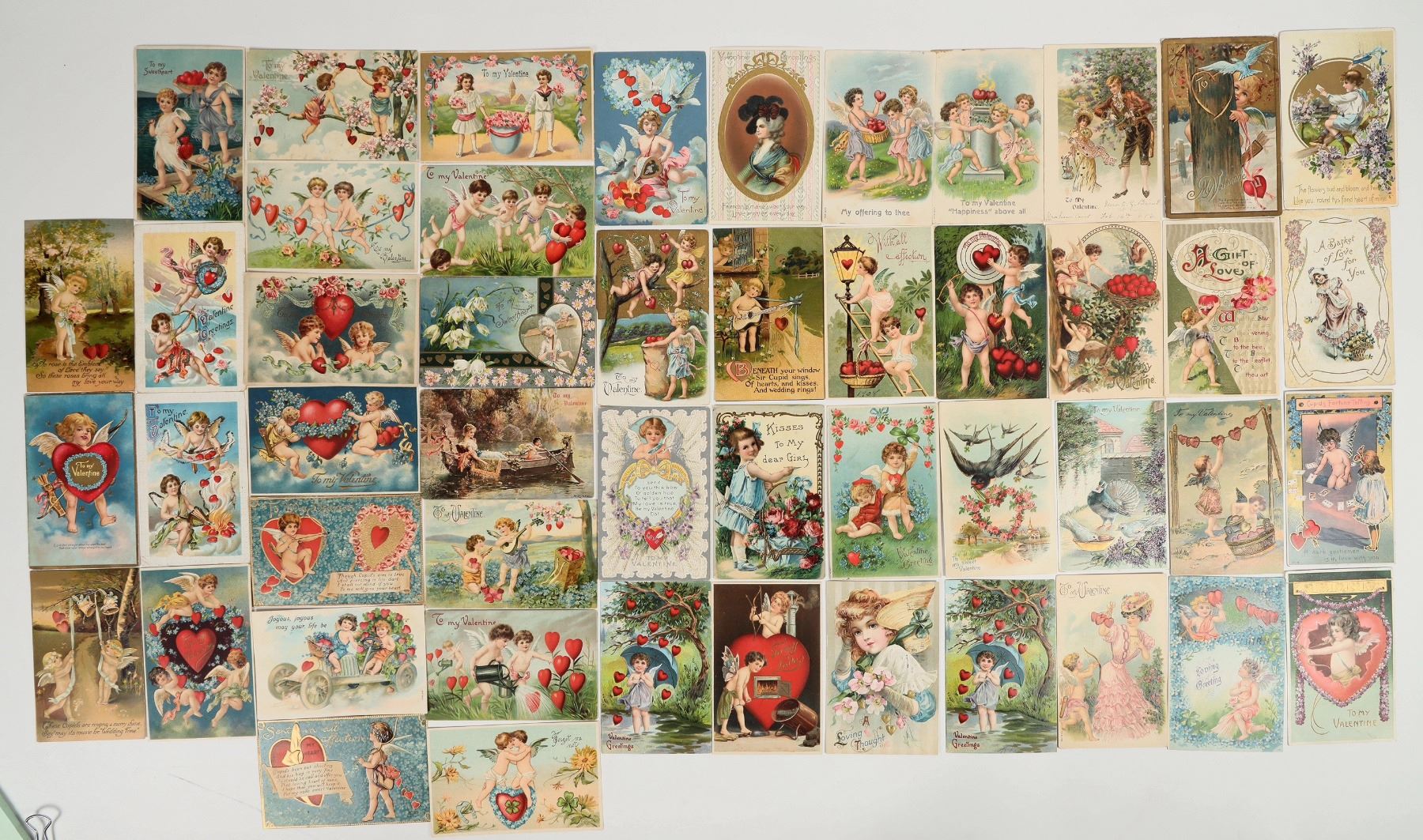 Vintage romantic sweetheart Valentine's day postcards, group of 46. All cards are embossed with no duplicates. Good condition, see photo. Measure 3.5x5.5".