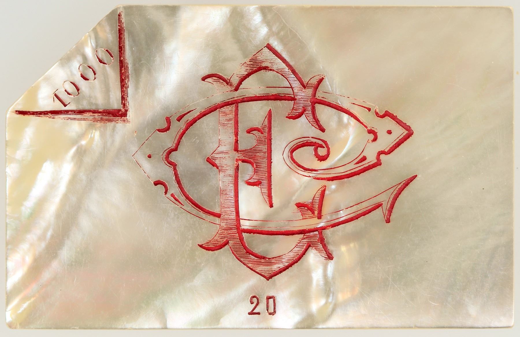 Elegant rectangular (75 x 48 mm) mother of pearl 1000 francs casino slab. Folded upper right corner shows "1000" on reverse. Engraved "C/E" on reverse with "20" at bottom. High denomination chip would make a great card cover for a poker player.