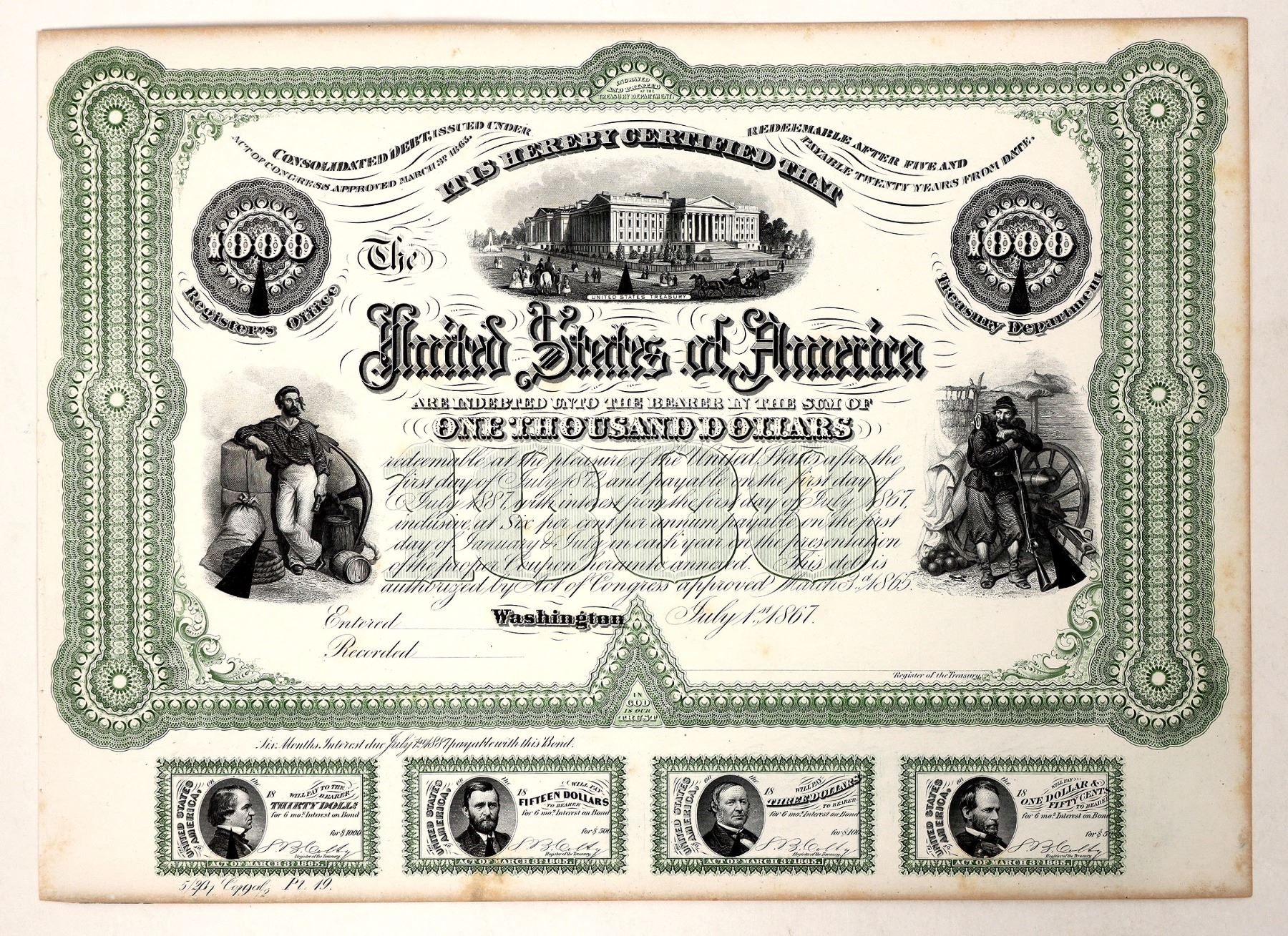 1867 $1000 US bond from counterfeit detector book. On thick stock with 4 coupons. Slight foxing.
