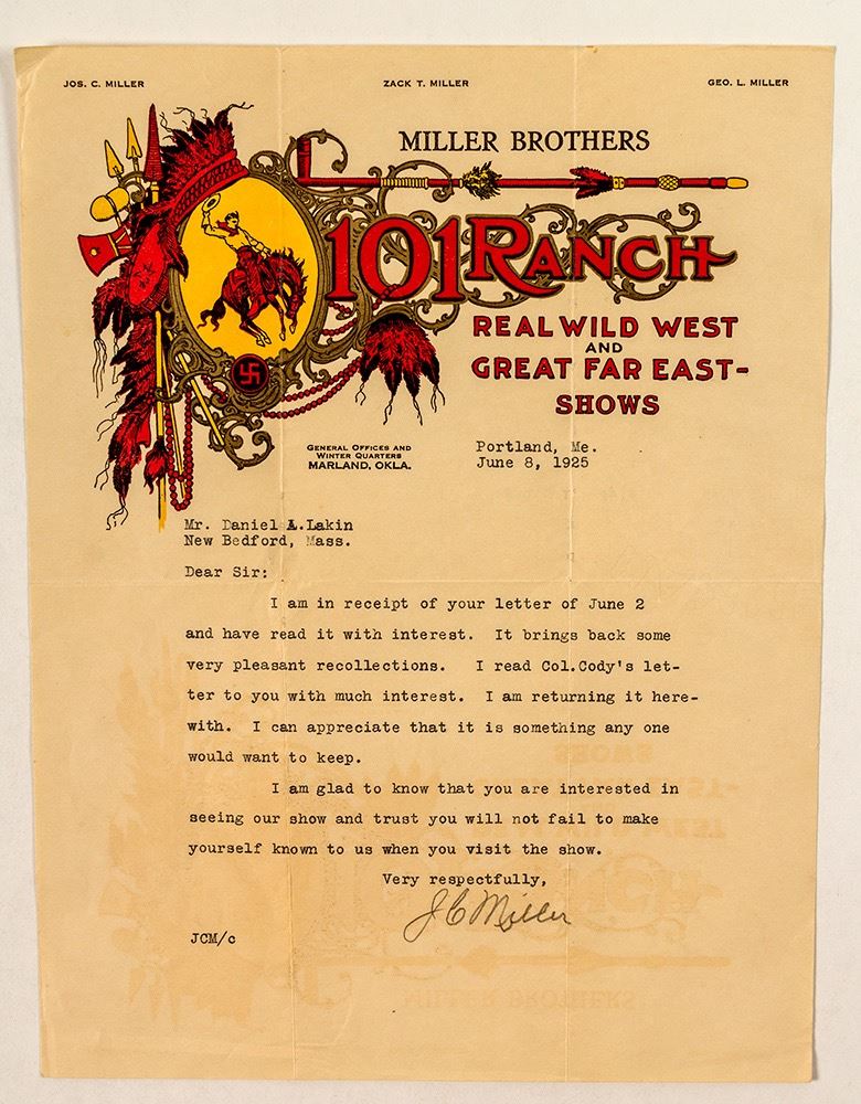 Letter written on 101 Ranch letterhead in 1925 and signed by J.C. Miller. The Miller Brothers 101 Ranch was a 110,000 acre cattle ranch in the Indian Territory of Oklahoma before statehood. At the time, it was the largest diversified farm and ranch in America (wiki). Interesting content to the letter. Daniel Lakin had forwarded a copy of a letter he had received from Col. Cody, and Miller read it "with much interest". This is one of the fanciest and neatest pictorial letterheads we have seen. A cowboy riding a bucking bronco, Indian headress and arrows. The 101 Ranch put on a wild west show beginning in 1907. In 1916, the Miller's even hired an aging Buffalo Bill to star in a WWI recruitment show. Soon Cody quit, and he died within a year. VF condition and rare. State:Oklahoma City:Marland Date:1925 ID# 49716