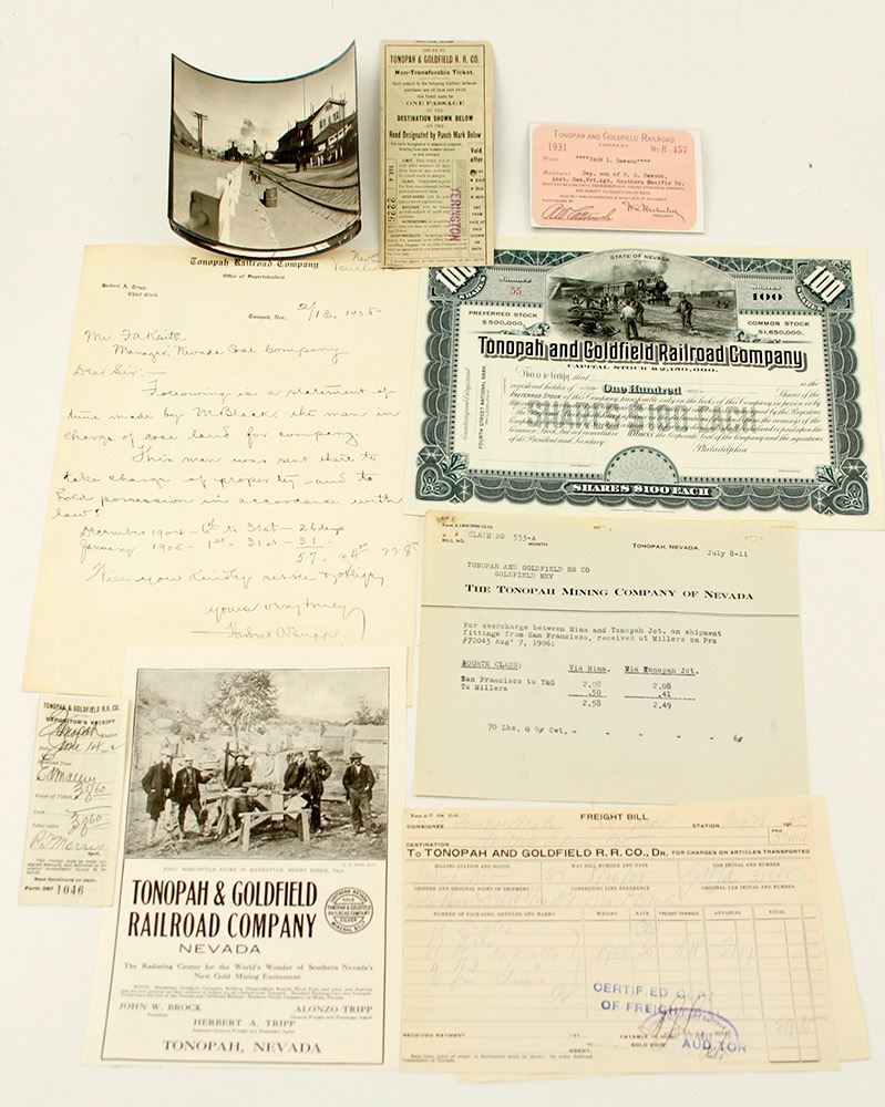 Lot of 11. 1 & 2. Small photographs of the Tonopah & Goldfield train depot. One with passengers walking next to the train. The other has tracks with men and cars from the 1930s at lower right. 3. Clipping of an ad by the Tonopah & Goldfield railroad. 4-6. Freight bills by the railroad issued in 1906 and 1911. 7. Correspondence regarding Nevada Coal Company land management. Dated 2/13/1905 on company letterhead. 8. Two attached tickets stamped "Yerington" across each. Three punch holes. 9. Depositor receipt for $38.60. 10. Rail pass for Jack Dawson, No. B 457. 11. Unissued stock, cert. #55 for 100 shares. Fancy vignette of railroad men and a train. City: Tonopah State: Nevada Date: 1900-30 hwac# 54734