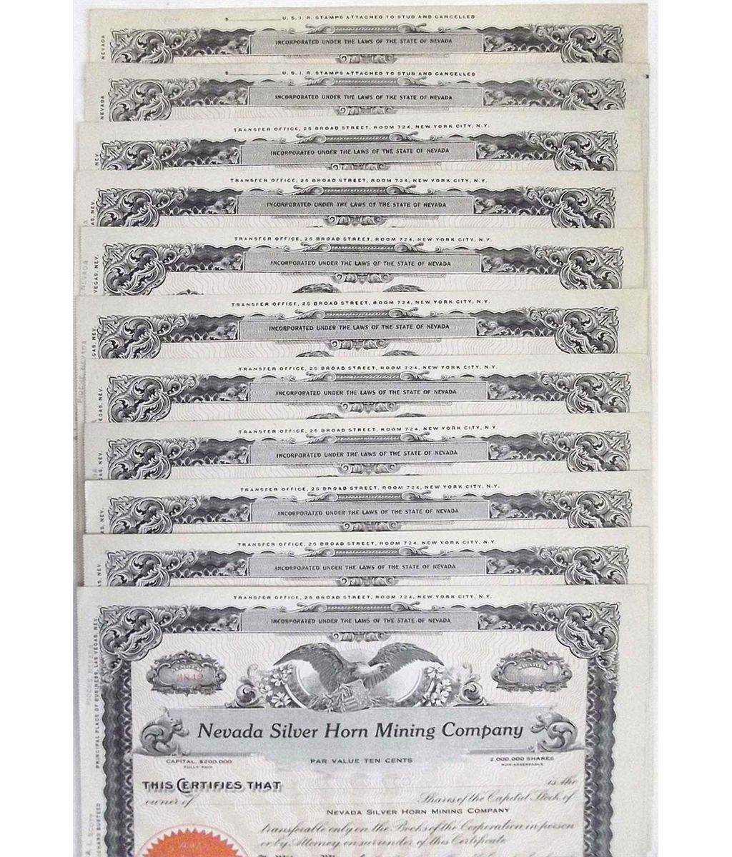 11 stock certs issued by Nevada Silver Horn Mining Company. For example # 2617 issued to AB Morley in 1922. Many unissued. Date 1922 Pioche, NV hwac 70054