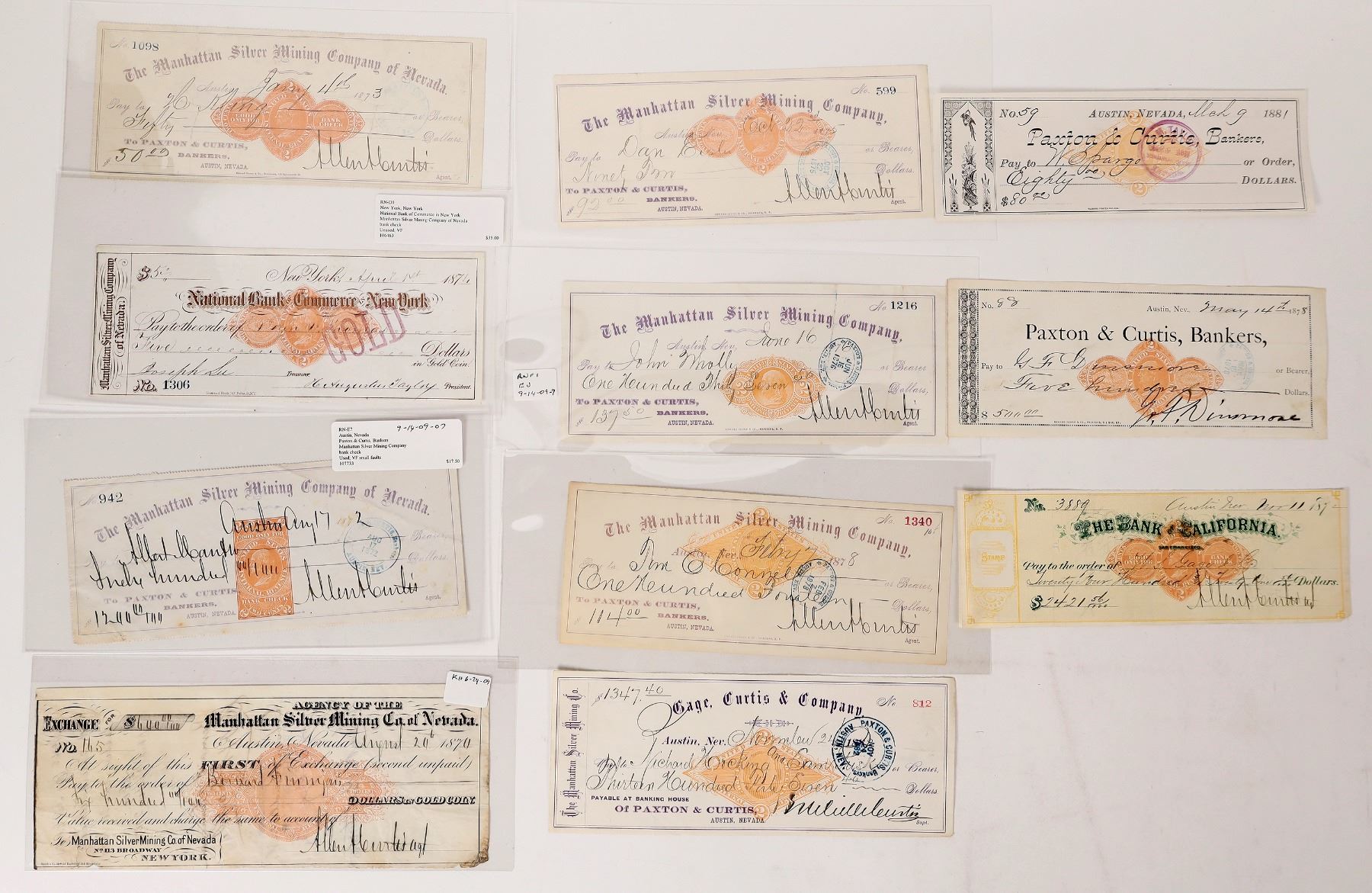 1) The Manhattan Silver Mining Co. of Nevada, #145, 1870 for $500. 2) The Manhattan Silver Mining Co. of Nevada, #942, 1872 for $1200(?). 3) The Bank of California, #3889, 1872 for 2421.56. 4) The Manhattan Silver Mining Co. of Nevada, #1098, 1873 for $50. 5) National Bank & Commerce New York, #1306, 1874 for $5. 6) The Manhattan Silver Mining Company, #599, 1875 for $92. 7) The Manhattan Silver Mining Company, #1216, 1876 for $137.50. 8) The Manhattan Silver Mining Company, #1340, 1878 for $114. 9) Paxton & Curtis Bankers, #88, 1878 for $500. 10) Paxton & Curtis Bankers, #59, 1881 for $80. 11)Page, Curtis & Coompany, #812, 1882 for $1347.40. Franklin Collection.