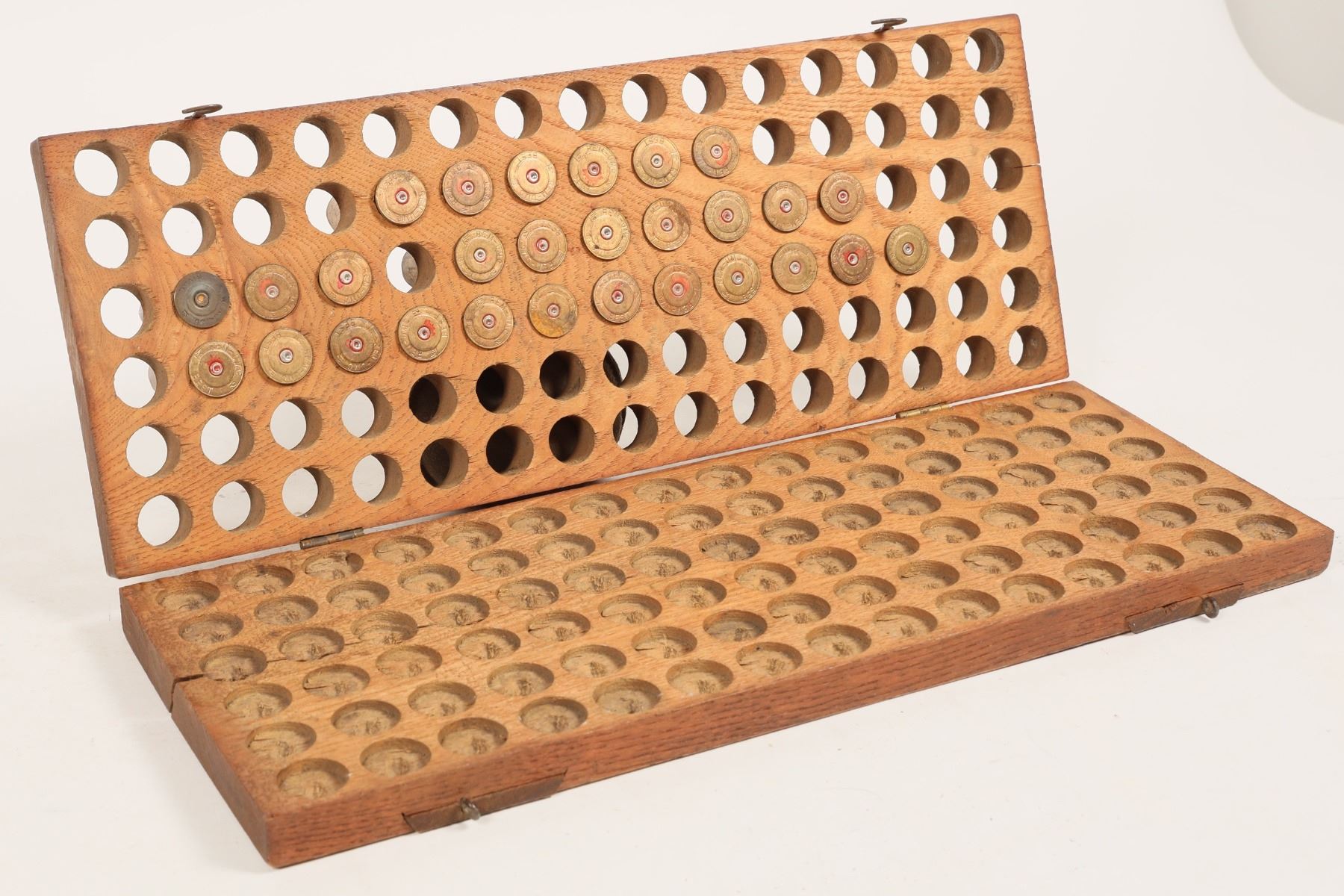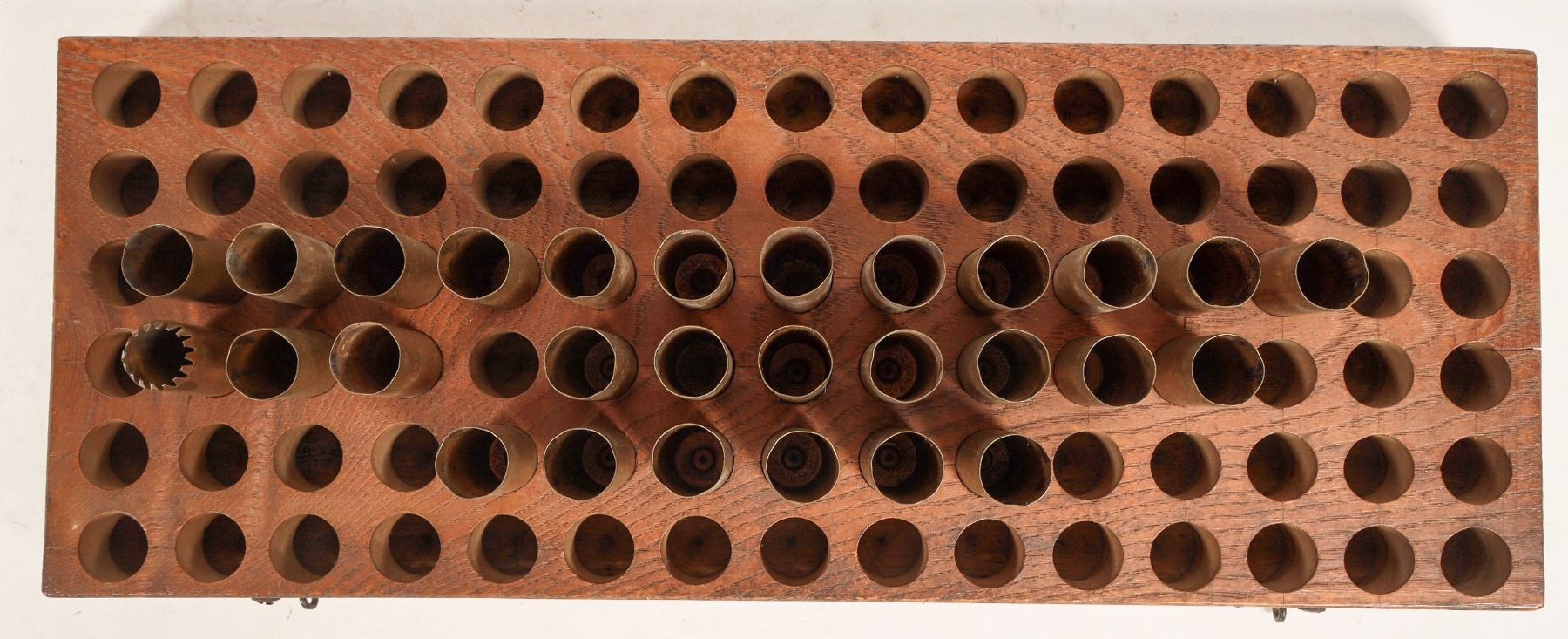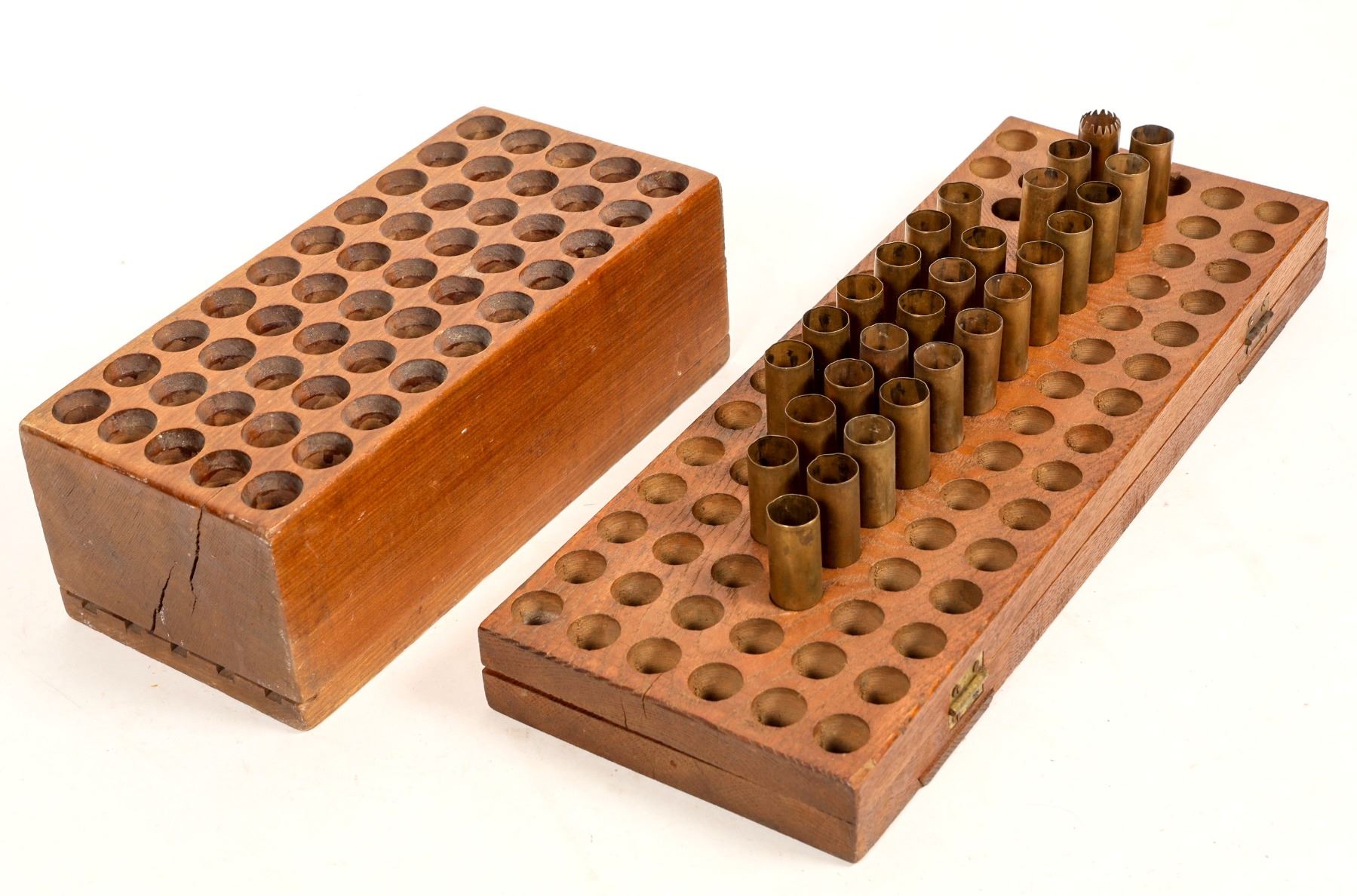 There are two reloading blocks for brass hulled 12 gauge shotgun shells in this lot. The hulls included are all 2.5 in. shells indicating usage from the 1870's to 1890's. The three brands of hulls are: W.R.A. & co. (Winchester Repeating Arms Co.), Rem.-UMC (Remington- Union Metallic Cartridge Co.), and Remington-Best. There are 28 hulls total. These reloading blocks are specific to their purpose. The 90 holed block captures the hull at the base so it can't move; black powder is measured and dropped into each hole and secured with two over-cards to separate the powder from shot and cushion the shot at ignition. The 50 holed block also captures the hull and each hole is funneled for a shot drop; later secured by another over card. 12 ga. hulls are reproduced today by Track of the Wolf for $8 ea. These reloading blocks were made precisely and would have been used by an extensive hunter, trap shooter, or gun club. Please see photo for details.