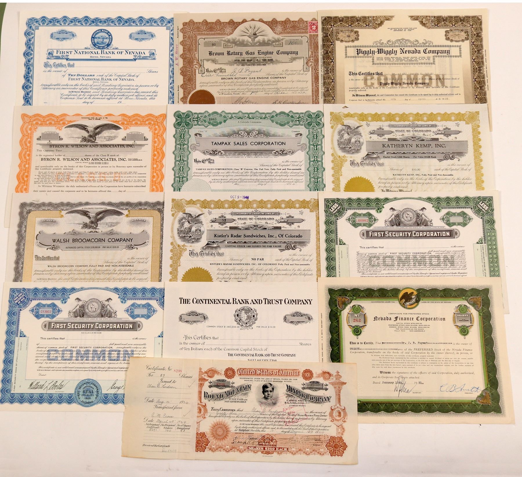 Lot of 13 different. Included: Brown Rotary Gas Engine Company (1915); Round Mountain Mining Company (1924); Piggly-Wiggly Nevada Company (1929); First National Bank of Nevada, Reno (uniss.); First Security Corporation (two different, uniss); Continental Bank & Trust Co. (uniss); Kistler's Radar Sandwiches, Inc., of Colorado (uniss.); Nevada Finance Company (1931); Walsh Broomcorn Company (uniss.); Katheryn Kemp, Inc. (uniss.); Tampax Sales Corp. (uniss.); and Byron R. Wilson & Associates, Inc. (uniss.). Heizer Estate