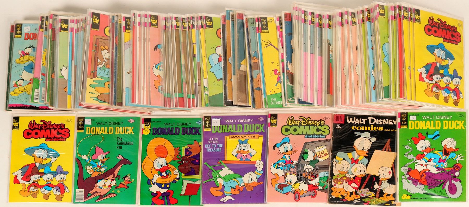 A nice group of 130 highly collectable Donald Duck comics under the Walt Disney's Comics and Stories" banner. The earlier editions were distributed by Dell Comics, but there are also Gold Key and Whitman "Variants." These copies are in good to very fine condition. There are also some highly desirable "Four Color" editions.