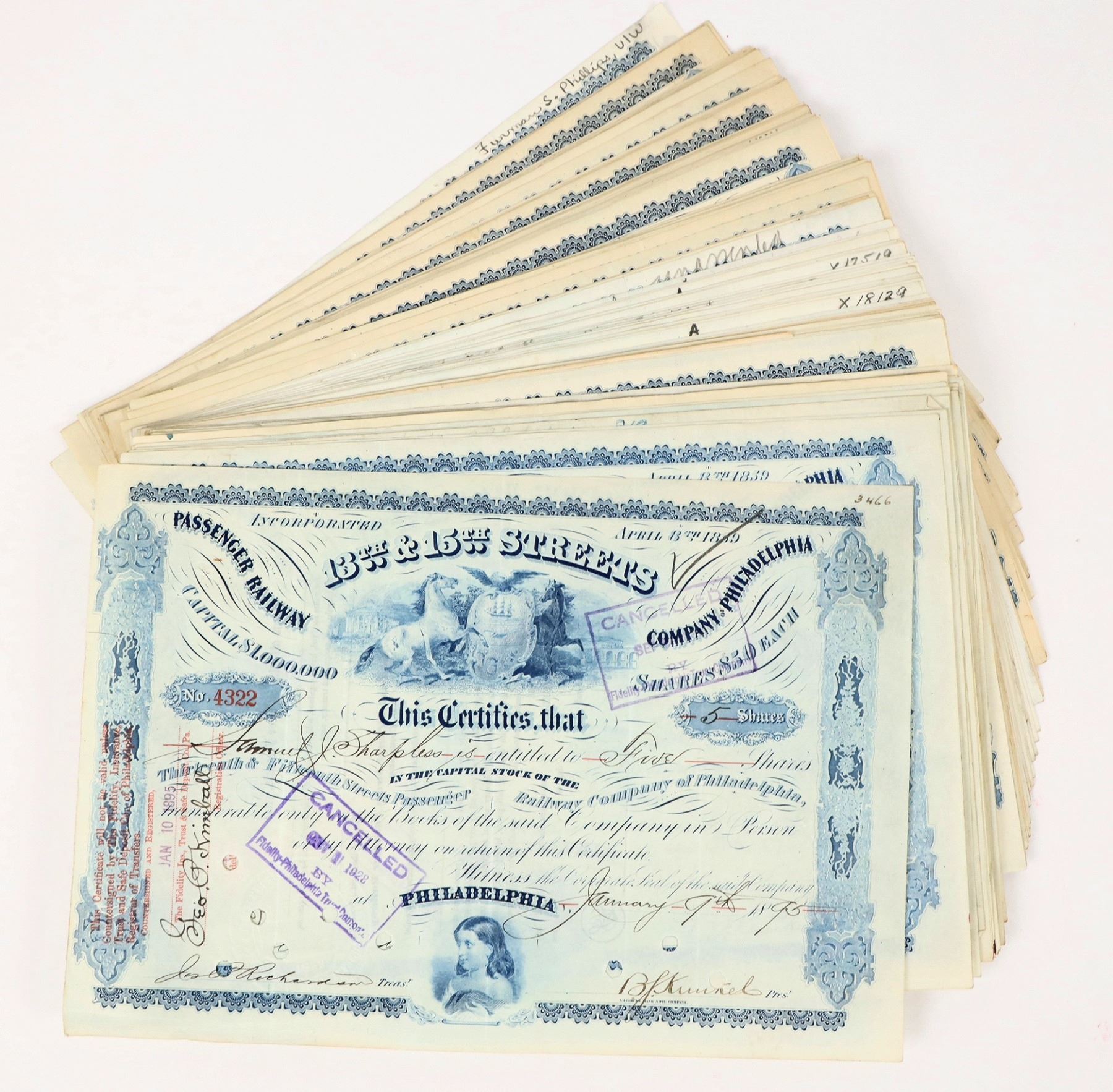 13th & 15th Streets Passenger Railway Company of Philadelphia 1890s-1930s cancelled issue stock certificates, ~30 pcs., pale blue, 7.0625 x 10.25 in., Treasurer, J.B. Basham et.al.; President, W.R. Warner Jr. et al.