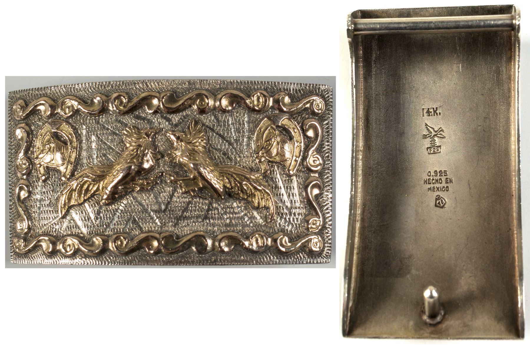 Hecho en Mexico. .925 silver buckle with 14 carat gold border design, horseshoes and fighting cocks. 3 inches by 1 5/8. Belt width 1 3/8 inches. State: City: HWAC#: 48235 Date: