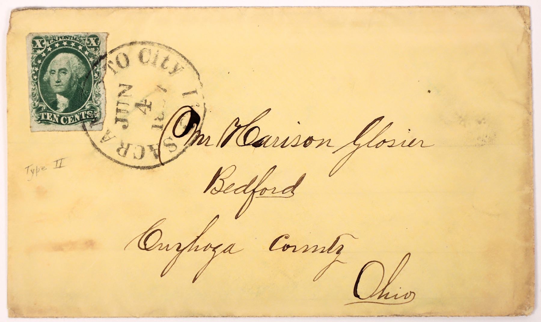 #14, 10d on cover from Sacramento to Ohio, 1855. XF.