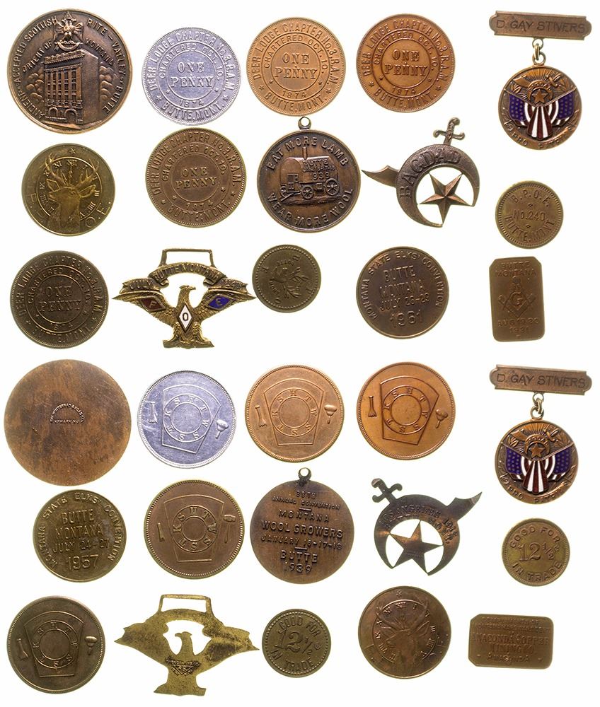 Lot includes: five Deer Lodge chapter no. 3 RAM tokens, 3 brass/copper, one aluminum; two State Elks Convention, 1957 and 1961; Montana Wool Growers, 1939; two BPOE no. 240, GF 12-1/2c IT; one Scottish Rite; one FOE, eagle shape; two different Bagdad; one Anaconda Copper Mining. State: Montana City: Butte Date: FHWAC#: 41638