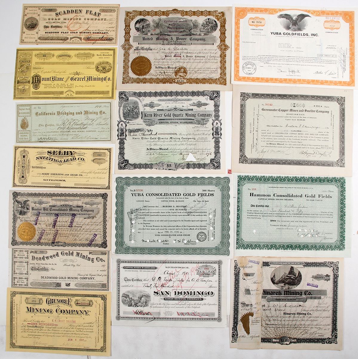15 different California mining stocks-United Water & power, Bunker Hill Consolidated Mining, Deadwood Gold Mining, Yuba Goldfields, Scadden Flat Gold Mining and more. Date: Location: California HWAC# 64021