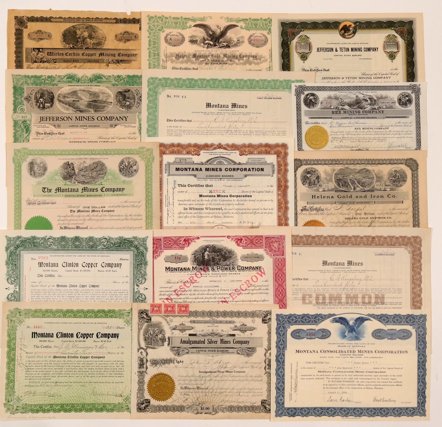 Lot of 15 different. All post-1900. Included: Montana Cons. Mines Corp. (1934); Montana Clinton Copper Co. (1910 plus unissued); Montana Mines Company (unissued); Montana Mines & Power Co. (1933); Montana Mines (2 diff. 1927); Montana Mines Corp. (1929); Helena Gold & Iron Company (1910); Rex MC (1937); Jefferson Mines Co. (1922); Jefferson & Teton MC (unissued); Helena Montana GMC (1916); Wickes-Corbin CMC (1917, poor condition); and Amalgamated Silver MC (1918). Please inspect. Ken Prag Collection