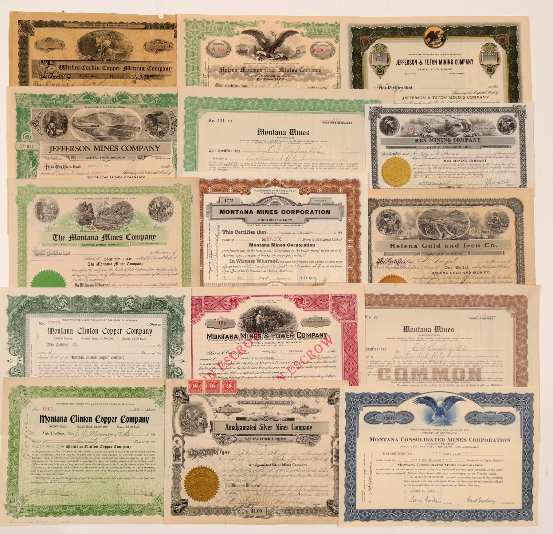 Lot of 15 different. All post-1900. Included: Montana Cons. Mines Corp. (1934); Montana Clinton Copper Co. (1910 plus unissued); Montana Mines Company (unissued); Montana Mines & Power Co. (1933); Montana Mines (2 diff. 1927); Montana Mines Corp. (1929); Helena Gold & Iron Company (1910); Rex MC (1937); Jefferson Mines Co. (1922); Jefferson & Teton MC (unissued); Helena Montana GMC (1916); Wickes-Corbin CMC (1917, poor condition); and Amalgamated Silver MC (1918). Please inspect. State: Montana City: Helena Date: 1910-1937