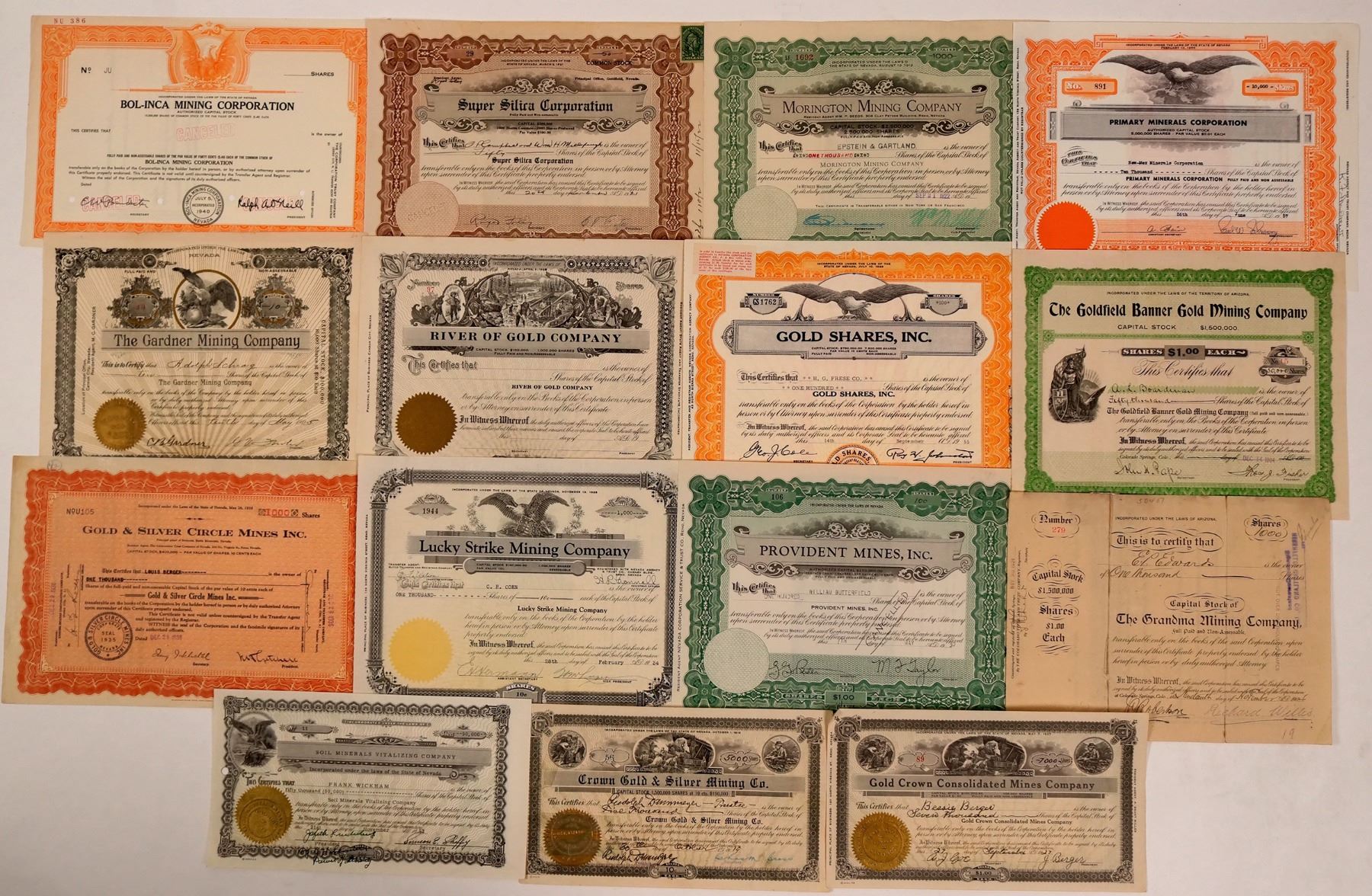 Lot of 15 different. Included: Goldfield Banner Gold Mining Co. (1904); Grandma MC (Goldfield, 1904); Provident Mines, Inc. (1930); Primary Minerals Corp. (1957); Lucky Strike Mining Co. (1934); Gold Crown Cons. Mines Co. (1927); Gold & Silver Circle Mines Inc. (Elko, 1936); Gold Shares, Inc. (1955); River of Gold Co. (unissued); Gardner MC (1905); Morington MC (1922); Super Silica Corp. (Esmeralda Co., 1921); Bol-Inca Mining Corp. (unissued); Soil Minerals Vitalizing Co. (1952); and Crown Gold & Silver MC (1919).