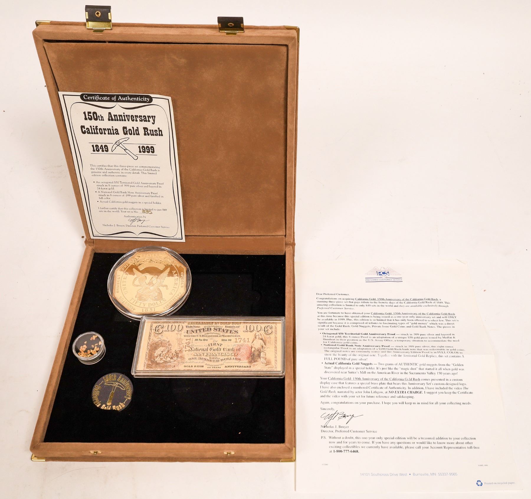 Issued by Preferred Customer Service in 1999, this brown velour box contains three pieces commemorating the 150th Anniversary of the California Gold Rush. An octagonal $50 Territorial Gold Anniversary Proof struck in 8 ounces of .999 pure silver and layered in 24-karat gold; A National Gold Bank Note Anniversary Proof struck in 8 ounces of .999 pure silver and layerd in 24-karat gold. Actual California gold nuggets in a special holder (approximately 25 tiny nuggets). Only 849 of these sets were made, this one was #335 with COA.