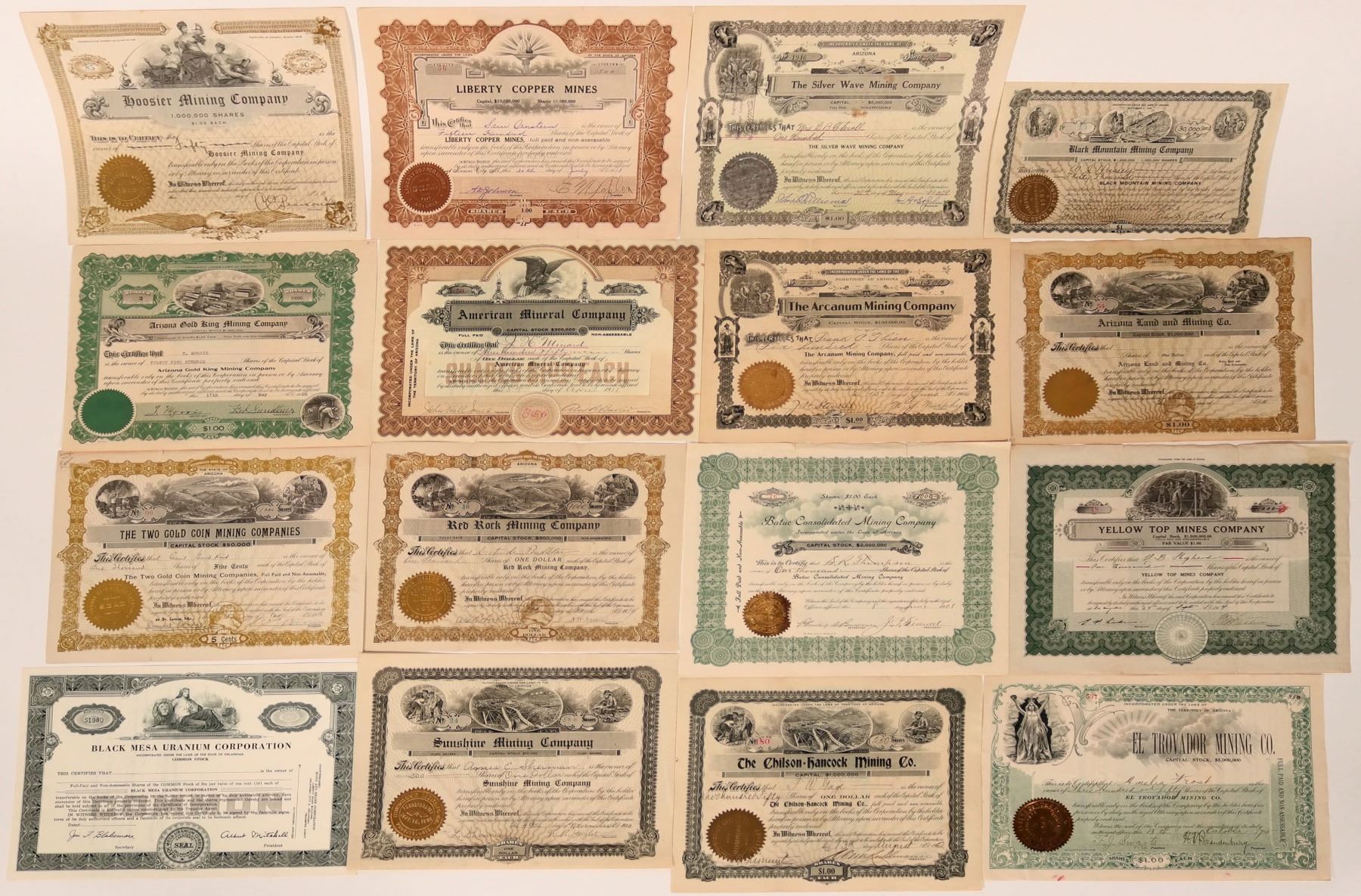 Lot of 16 different. Included: Two Gold Coin MC (1916); Arizona Gold King MC (1920); Liberty Copper Mines (1918); Hoosier MC (unissued); El Trovador MC (1905); Yellow Top MC (1914); Arizona Land & Mining Co. (unissued); Silver Wave MC (1909); Black Mountain MC (1906); Chilson-Hancock MC (1902); Batuc Cons. MC (1908); Arcanum MC (1906); Sunshine MC (1910); Red Rock MC (1914); American Mineral Co. (1911); and Black Mesa Uranium Corp. (unissued). Please inspect.
