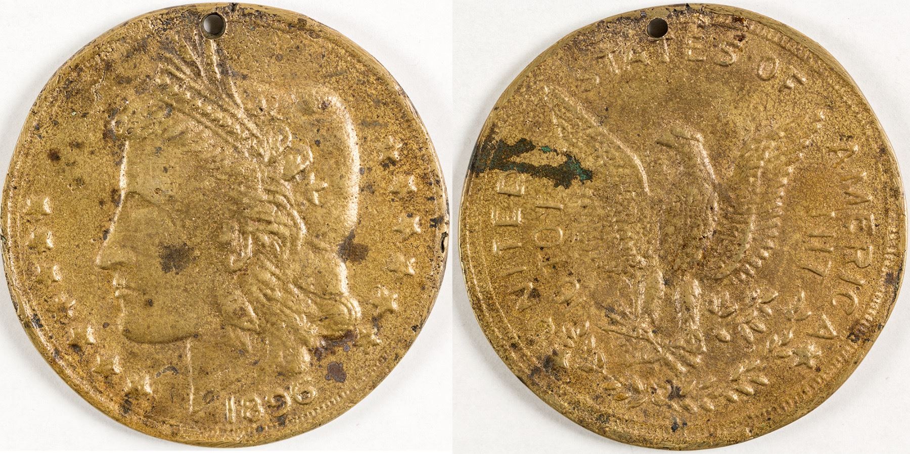 Bronze medal 3 1/4" in diameter. Obv.: Liberty head / 1896; rev.: United States of America / 16 to 1 / N I T. S-805. Holed. Bryan's Republican opponent, William McKinley, was endorsed by those who favored a single-metal, gold standard. They pointed out that if the Free Silver proposal were literally implemented, a coin containing a dollar's worth of silver would be "as big as a stove lid!" Hence, the size of this satirical piece, and 16 to 1 on the reverse. The letters NIT stand for "Not in Trust." City: State: Date: 1896 HWAC# 51852