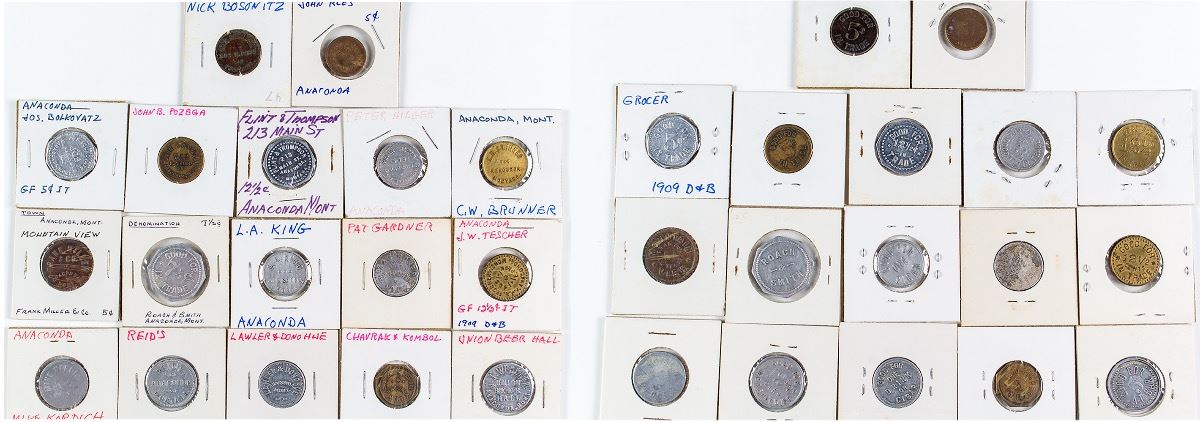 1) J. W. Tescher // GF / 12 1/2c / IT. Round, brass. 2) Roach/ & / Smith // GF / 7 1/2c / IT. Octagonal, aluminum. 3) L. A. King // GF / One / cigar. round, aluminum. 4) Frank Miller / & Co. // GF / 5c / IT. Round, brass. 5) Flint & Thompson // GF / 12 1/2c / IT. Octagonal, aluminum. 6) C. W. Brunner // GF / 12 1/2c / IT. Round, brass. 7) John Rees // GF / 5c / IT. Round, brass. 8) Jos. Bolkovatz // GF / 5c / IT. Octagonal, aluminum. 9) Mike Kordich // GF / 5c / IT. round, aluminum. 10) Chavrak & Kombol // GF / 5c / IT. Octagonal, brass. 11) Nick Bosonitz // GF / 5c / IT. Round, brass. 12) Peter Hilger // GF / 12 1/2c / IT. Round, aluminum. 13) Union / Beer / Hall // GF 5c IT. Round, Aluminum. 14) Lawler & Donohue // GF / One / Drink / or / Cigar. Round, aluminum. 15) Reid's // GF / 12 1/2c / in / Merchandise. Round, aluminum. 16) John B. Pozega // GF / 5c / IT. Round, brass. 17) Pat Gardner // GF / One / Drink. Round, aluminum. City: Anaconda State: Montana, Date: Inventory# 38812
