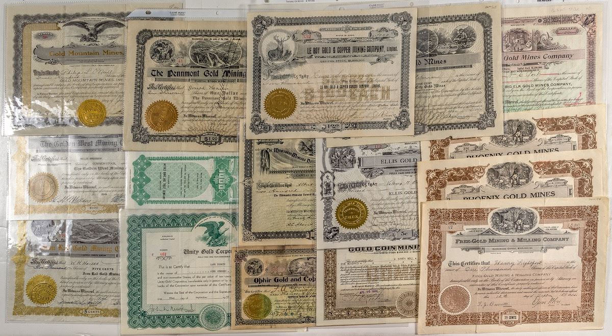 Included are: Pennmont Gold Mining Co., no. 41, 1000 shares, 1903, cancelled; Milwaukee-Montana Natural Bridge Gold & Copper Mining Co., no. 981, 200 shares, 1901; Le Roy Gold & Copper Mining Co., Ltd., no. 332, 5000 shares, 1913; Cooke City Gold Mines, no. 19, 5000 shares, 1936; Iron Rod Gold Mining Co., no. 374, 5000 shares, 1940; Gold Mountain Mines, Inc., no. 58, 500 shares, 1934; and more. City: State: Montana Date: ID: 36223