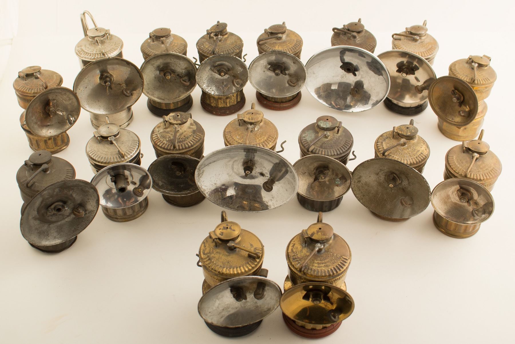 17 small carbide lamps with a 1925 patent. Three of these are nickel plated, the rest are brass, varying conditions from excellent to well used. One model is the tall variety, while another two others have medium size reflectors. A nice group. State: City: HWAC#: 46377 Date: