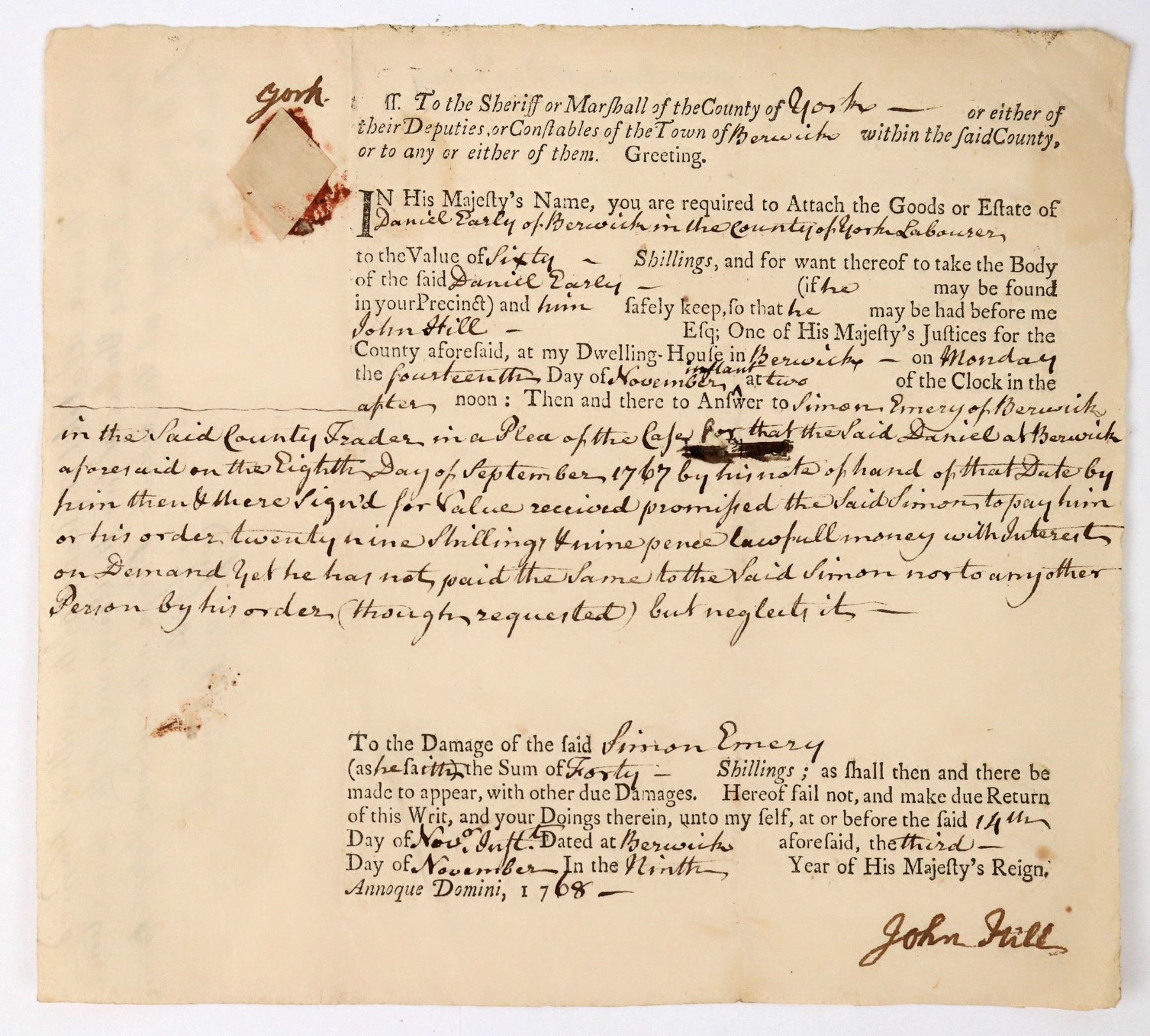 Colonial era court summons to collect a damage of 40 shillings. Page measures 7.5"x6.8". Comes with a small outsourced report on Honorable John Hill and partial transcript. Minor foxing, see photo.