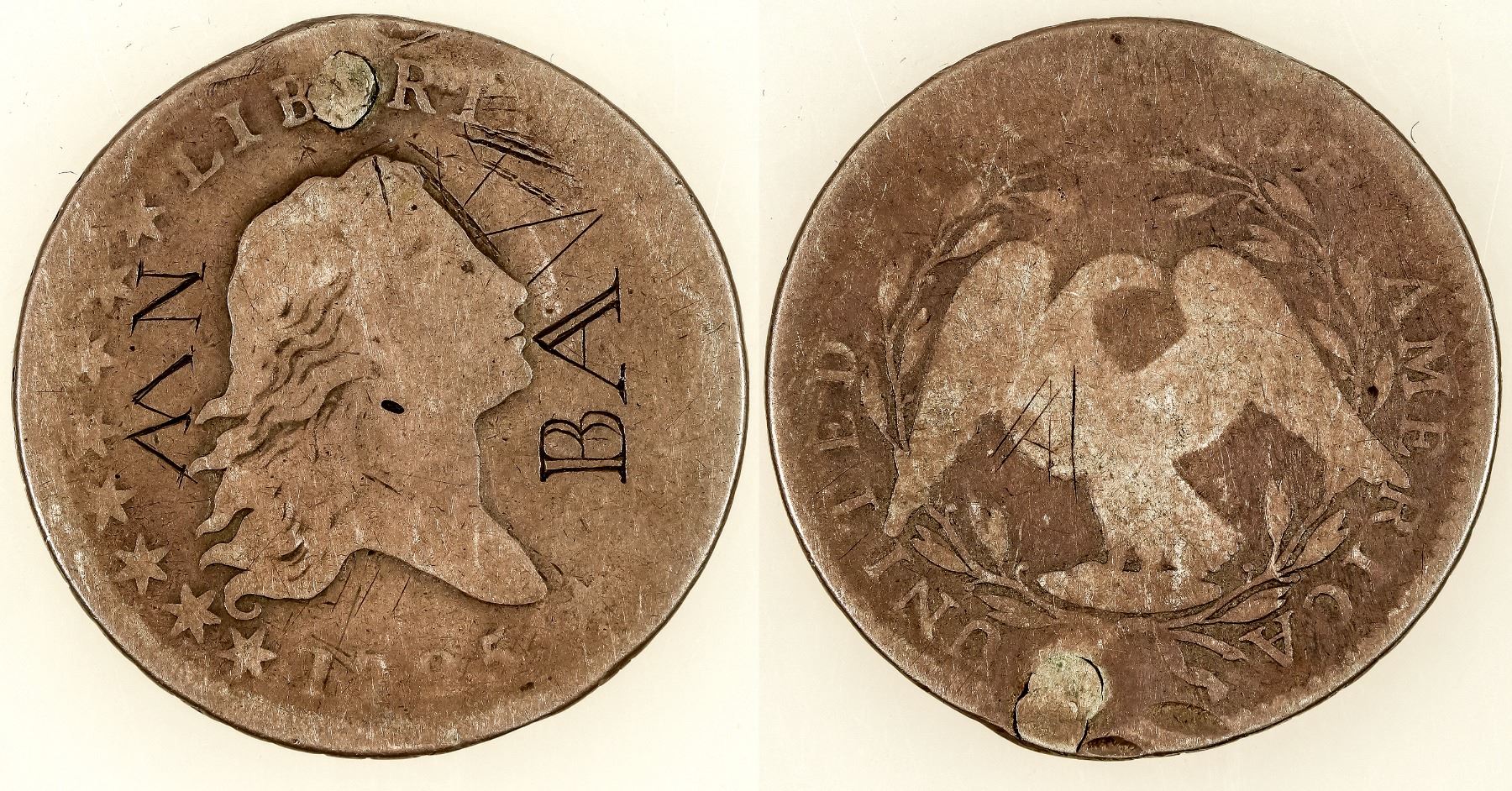 Plugged, counter stamped ("BA" & "NW") 1795 Flowing Hair half dollar. Mintage 317,844; 22 varieties. Poor-Fair condition, but it's seen some history. [] [] [] [] []
