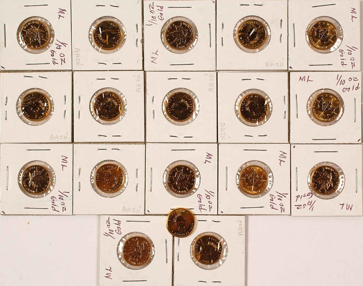 Eighteen 1998 one tenth ounce Canadian Maples. All uncirculated. 1.8 oz. total Date: 1998 Location: Canada HWAC# 75058