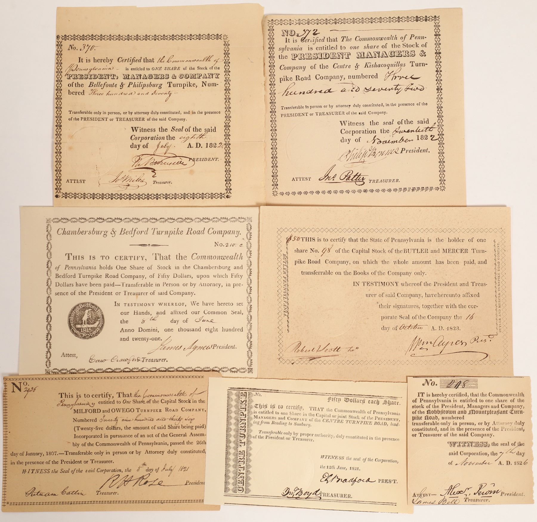 All issued on canceled and in excellent condition. Bell font and Philipsburg Turnpike, July eighth 1822. Centre and Kisha Chela Turnpike, November 20, 1822. Chambersburg and Bedford Turnpike, June 8, 1821. Butler and Mercer Turnpike, October 16, 1823. Milford and Owego Turnpike, July 5, 1821. Hobbs town and Mount Pleasant Turnpike November 7, 1826. Centre Turnpike, June 12, 1821.