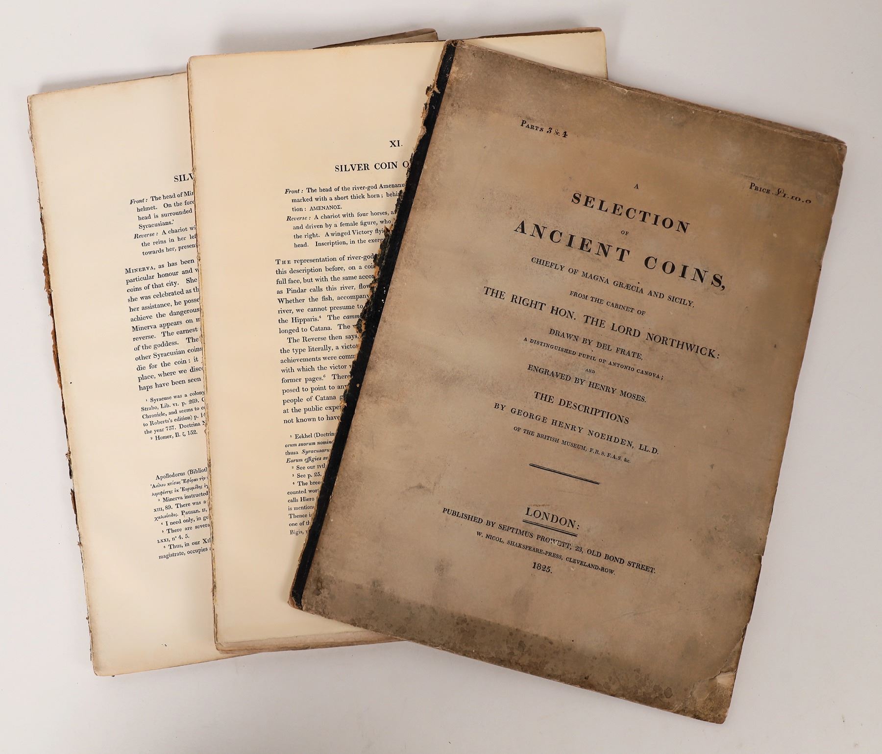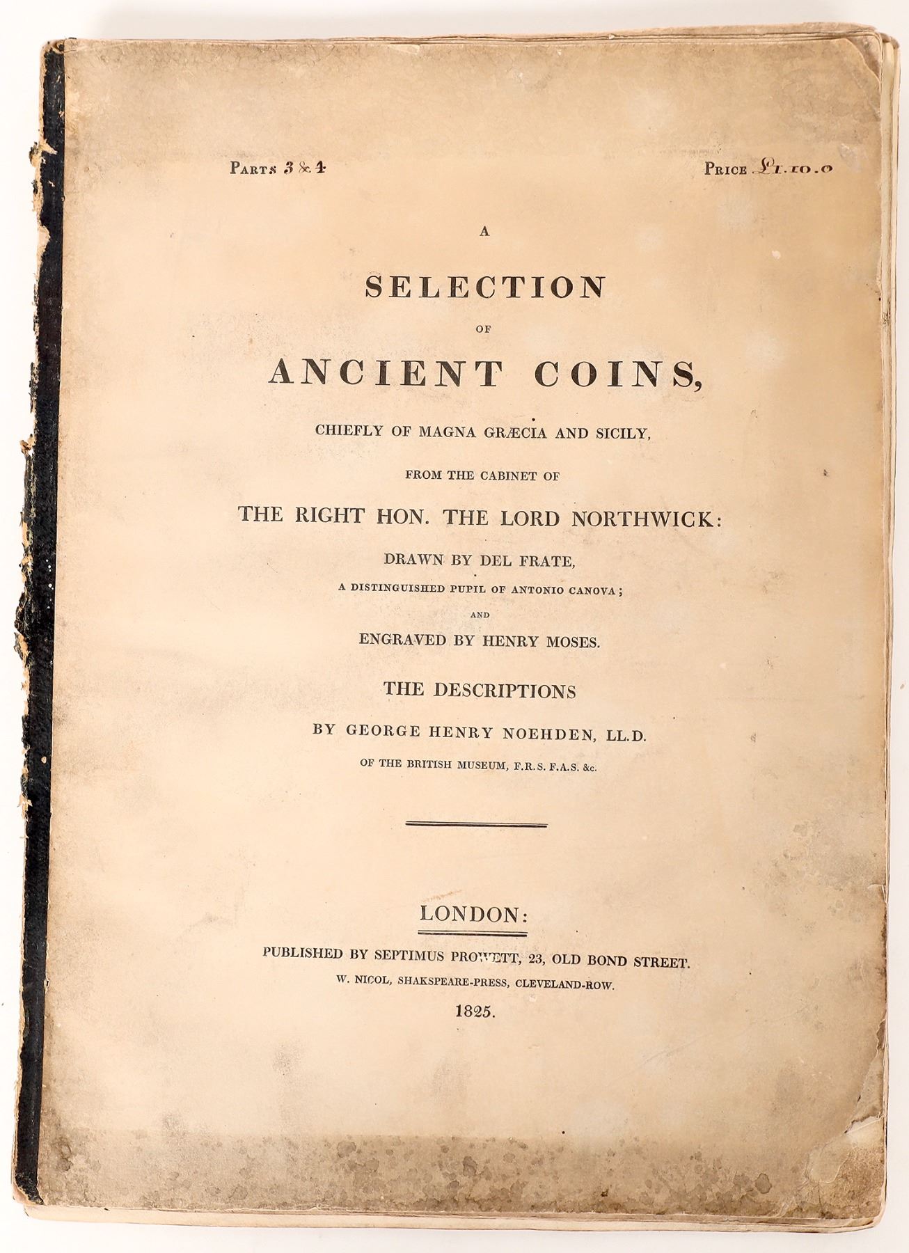 Selection of Ancient Coins guide, published in 1825 from the cabinet of the Right Hon. The Lord Northwick and drawn by Del Frate. Book is 63 pages, with engravings by Henry Moses. This softcover volume measures 10"x 15" and is in decent condition. Please see photos for more details. United Kingdom 1825
