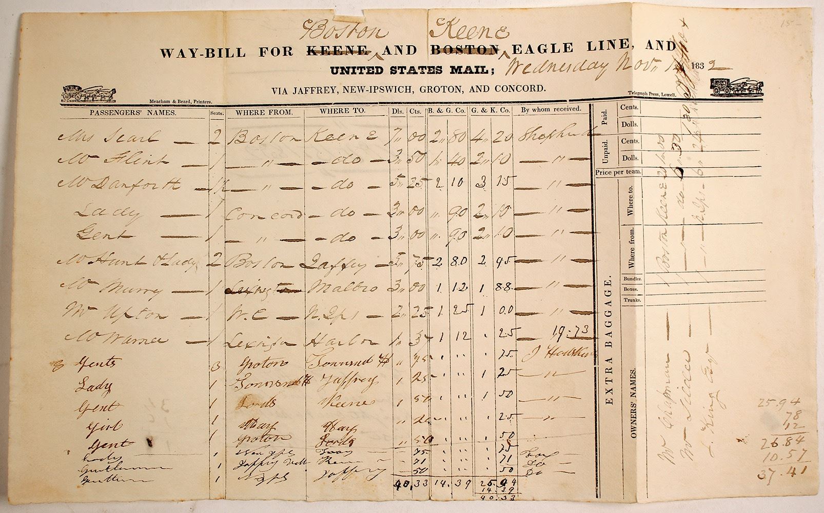 Way-Bill for the Boston & Keene Eagle Line and United States Mail, via Jaffrey, New-Ipswich, Groton, and Concord. Dated Nov. 14, 1832. Two small stagecoach vignettes in upper corners. Seventeen passenger entries. 8.5 x 14" Folds, some separation. (Prag Collection) Date: Location: Boston, Massachusetts HWAC# 55414