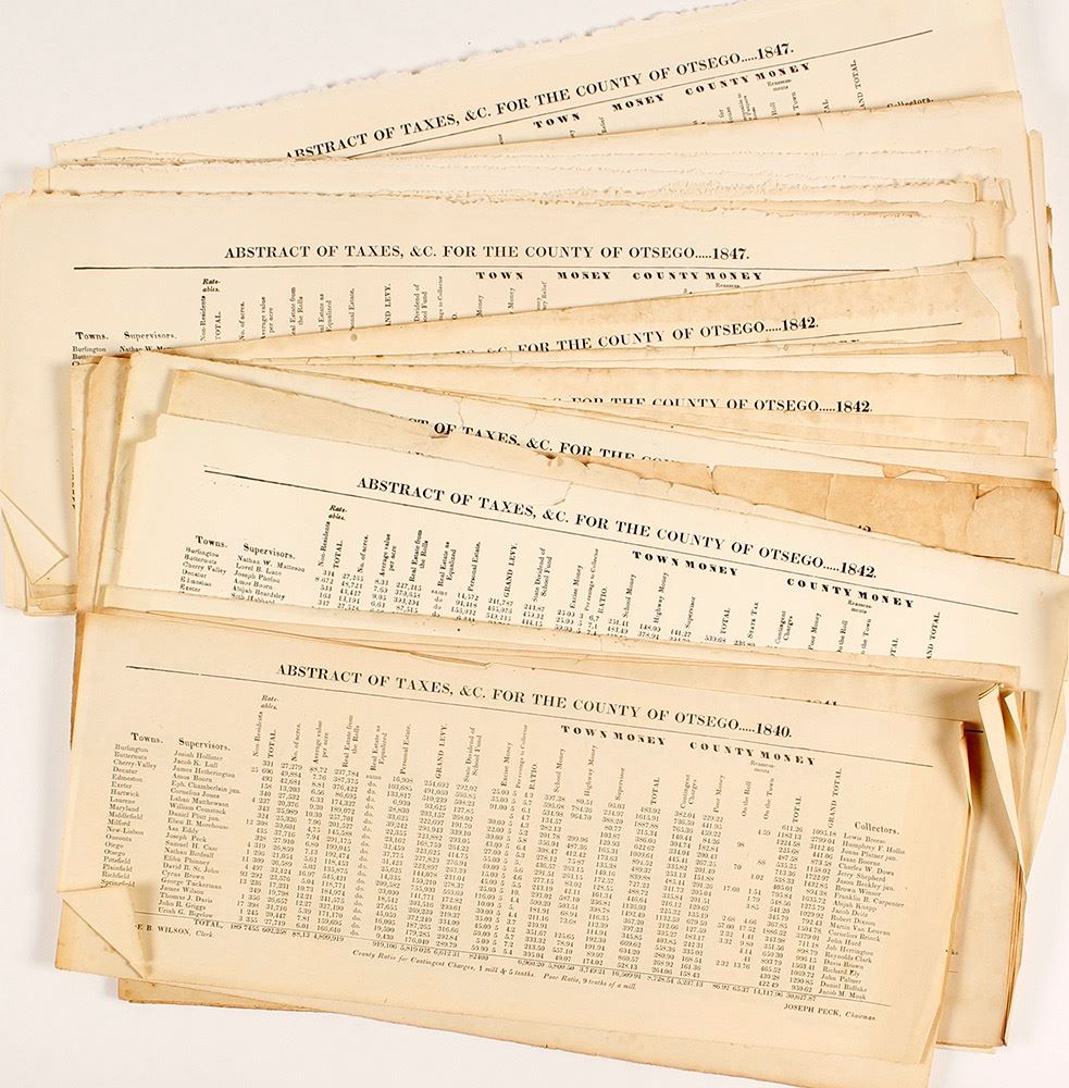 58 Abstract of Taxes. Some condition issues with slight tearing. 7" x 18". Date: 1840's Location: Ostego, New York HWAC # 54265