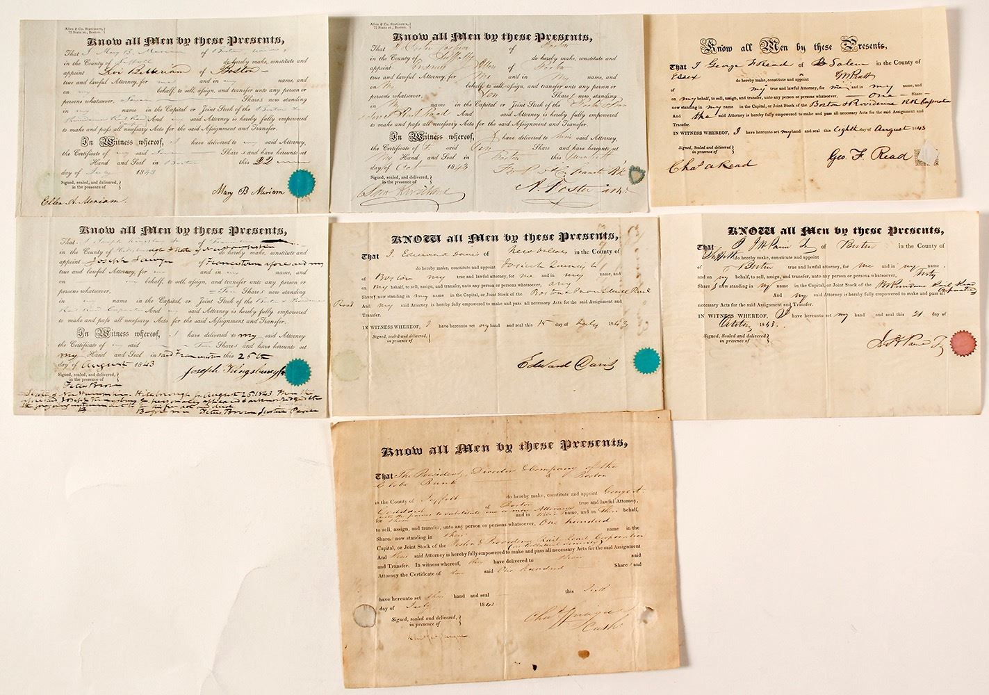 Lot of 7 legal appointment documents related to stockholders for the Boston & Providence Railroad. All are dated in the 1840s. The Boston & Providence Railroad opened in two sections in 1834 and 1835, making it one of the first rail lines in the US. A more direct route into Providence, Rhode Island was built in 1847. Branches were built to Dedham in 1834, Stoughton in 1845, and North Attleboro in 1871. In 1888, it was acquired by the Old Colony Railroad , which in turn was leased by the New Haven Railroad in 1893. Later, the system was absorbed by Penn Central and Amtrak. (Prag Collection) Date: Location: Boston, Massachusetts HWAC# 55433