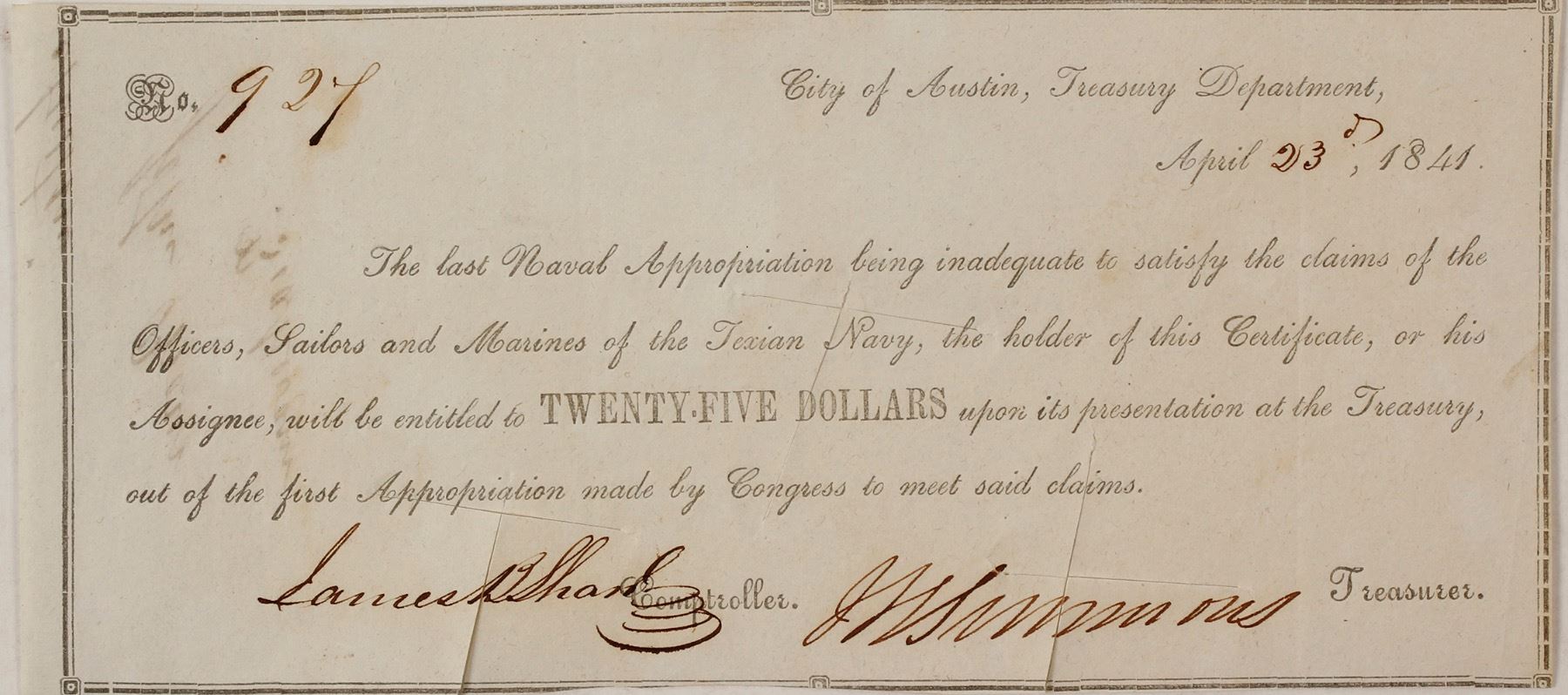 City of Austin granting boatswain John Brown (signature on back) $25 when the first appropriations are made. Texas was a sovereign country at this time (1837-1847). Dated April 23, 1841. Perhaps for the Santa Fe Expedition. "The last Naval Appropriations being inadequate to satisfy the claims of the officers, Sailors, and Marines of the Texian Navy...." Signed by comptroller Samuel B Shank and treasurer JS Simmons(?). Date: 1841 Location: Austin, Tennessee HWAC# 57360