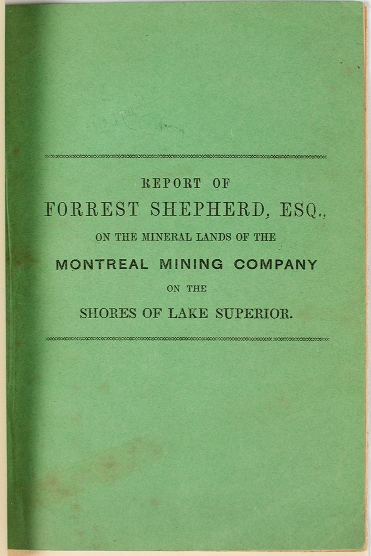 32 pages. "Report of Forrest Shepherd, esq., on the Mineral Lands of the Montreal Mining Company on the Shores of Lake Superior." Shepherd surveyed copper and iron mines at Lake Superior in 1846 and then the mineral lands between Lake Superior and Hudson's Bay the following year. This report is his description from his 6-month exploration in 1846. Describes eighteen mining locations in great detail. No maps or figures. Please inspect. Protective cover over original. Missing back cover. Toning to pages. 8.5" x 5.5" No printer listed. State: zCanada City: Montreal HWAC#: 34816 Date: