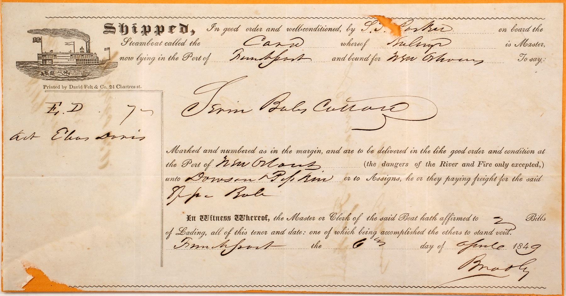 Pictorial receipt for bales of cotton stored on Steamboat Cain(?) at the port of Frenchport and bound for New Orleans. Dated April 6th, 1848. 5.5 x 10.5" Large spindle hole and tear bottom left. Small riverboat vignette upper left. Date: City: New Orleans State: Louisiana HWAC# 67024