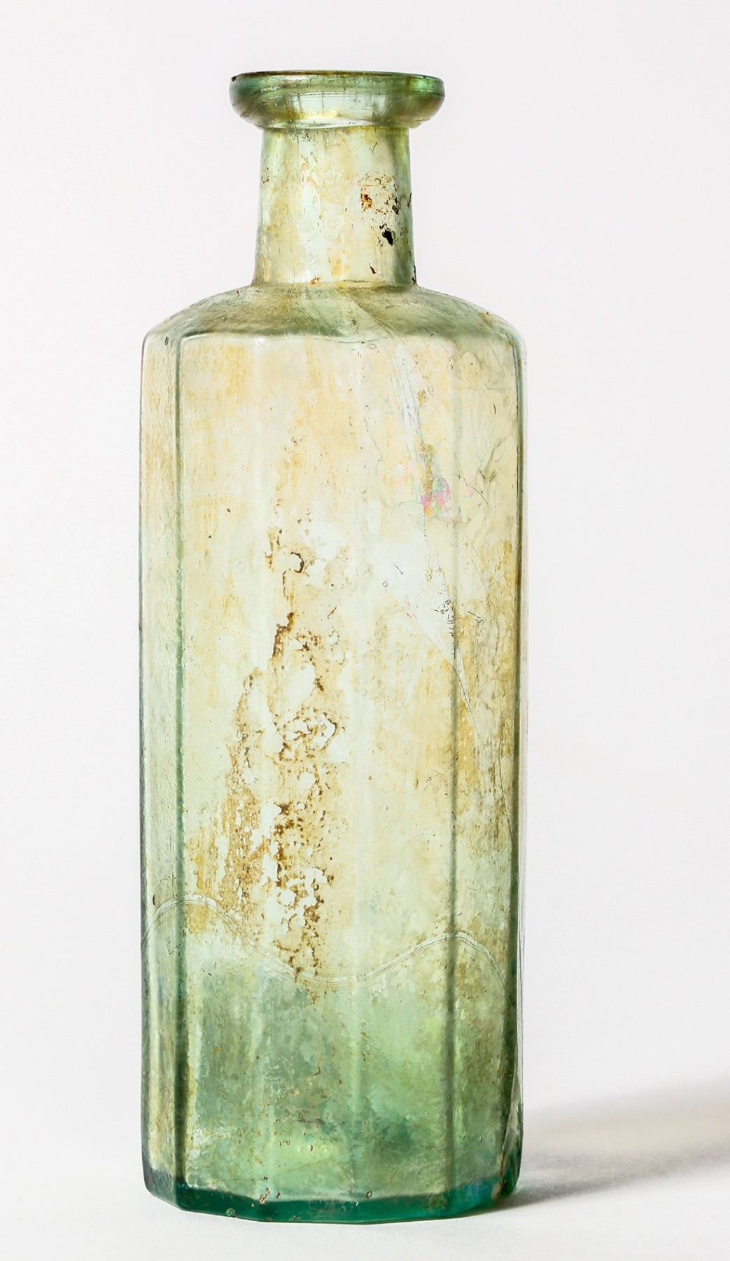 This is a vintage twelve-sided medicine bottle. It's a striking example of early pharmaceutical glassware. Measuring approximately 6 inches tall and 2 inches wide, and has an open pontil. The bottle has an iridescent sheen to the glass, making this bottle benicia patina. It is slightly damaged with a flaked chip about 0.5 inches at its base; otherwise, the bottle is in good condition.