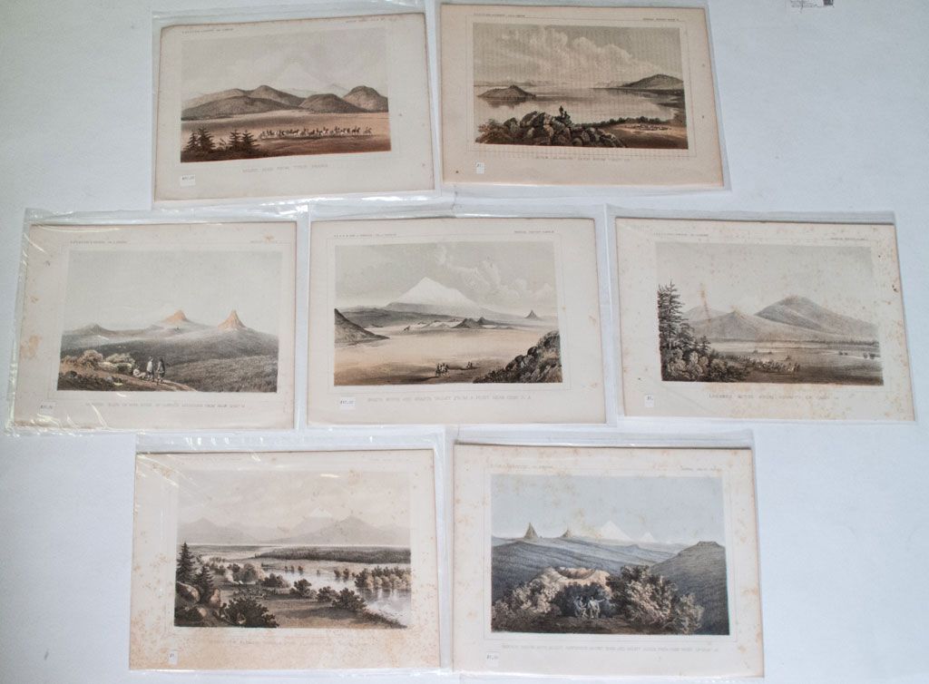 Lot of 9. 1) Western slope of main ridge of Cascade Mountains from Camp M, Cal & Oregon survey, geology. 2) Lassen Butte from vicinity of Camp 18 showing party on the move, Cal & Oregon survey, general report. 3) Mount Hood from Trysch Prairie, Cal & Oregon survey, general report. 4) Cascade Range including Mounts Jefferson, Hood, and Adams from pass west of Camp 40, Cal & Oregon survey, general report. 5) Upper Klamath Lake from Camp 28, Cal & Oregon survey, general report. 6) Shasta Butte and Shasta Valley from a point near Camp 70 A, Cal & Oregon survey, general report. 7) Mount Pitt, Klamath River, and Upper Klamath Lake from Camp 30, Cal & Oregon survey, general report.8) Mouth of Fall River near camp 20 with three Indians around campfire, Cal & Oregon survey, general report. 9) Mount Jefferson and Black Butte from camp S, Cal & Oregon survey, General report plate X. Some staining. Date c1850s , hwac 9564